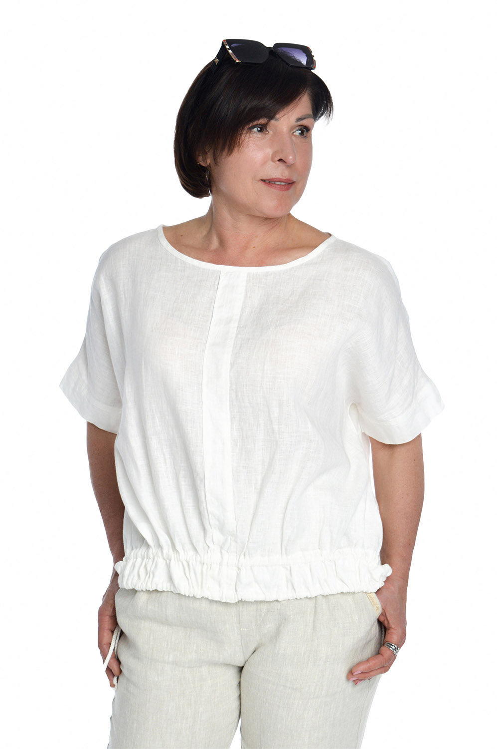 Laisvo stiliaus lininė palaidinė sutraukiama apačia. Kimono tipo trumpomis rankovėmis. Apačia susiaurinama sutraukiamomis ir užfiksuojamomis virvelėmis, taip reguliuojant palaidinės plotį.
