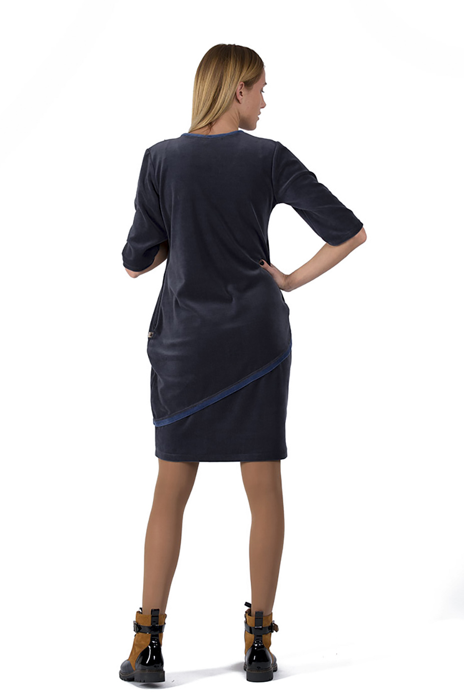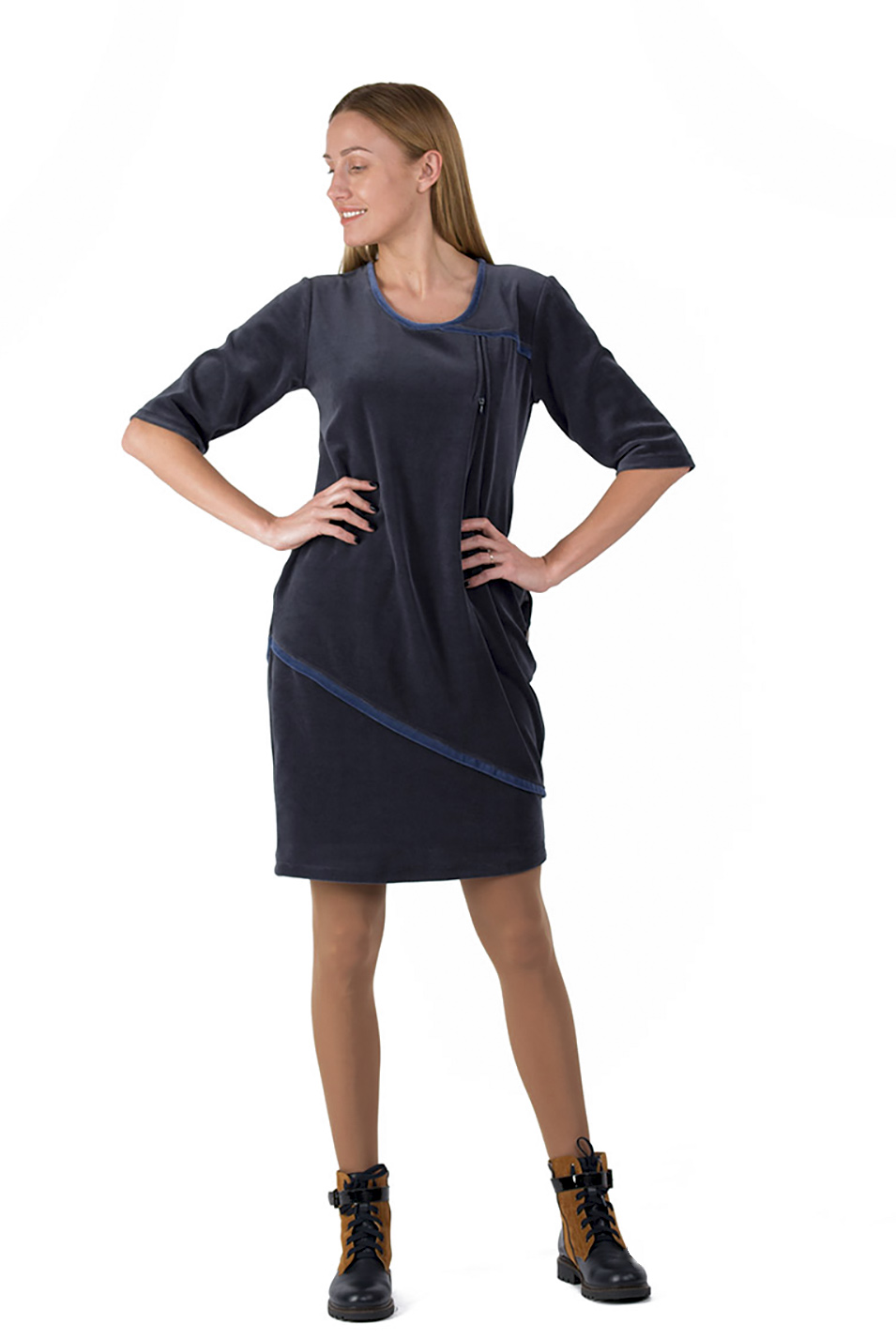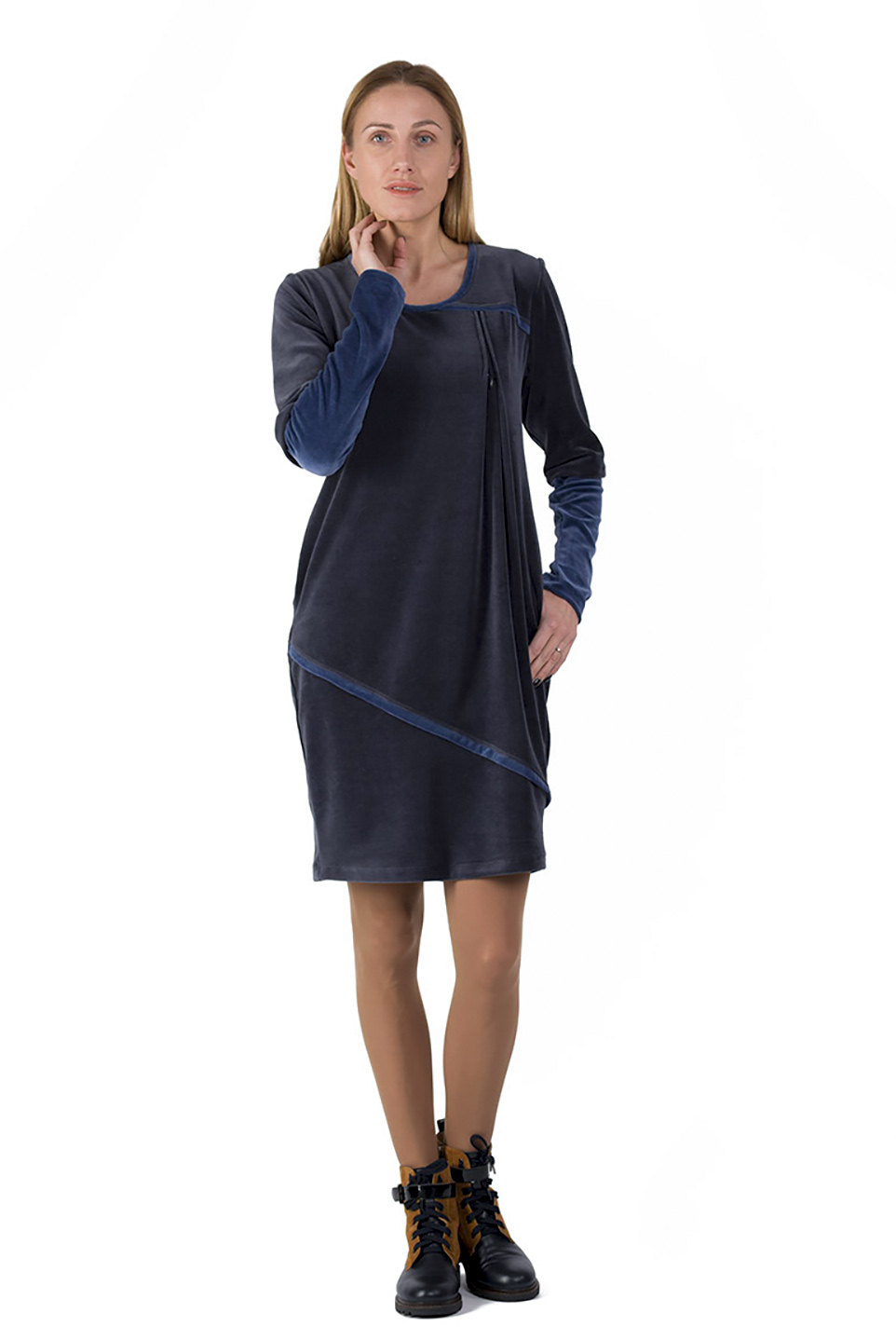 Stilinga dviejų spalvų trikotažinė suknelė laisvalaikiui. Priekyje įsiūtas užtrauktukas reguliuoja suknelės siluetą (gali būti šiek tiek siauresnė/platesnė). Suknelės rankovės laisvai nuimamos.