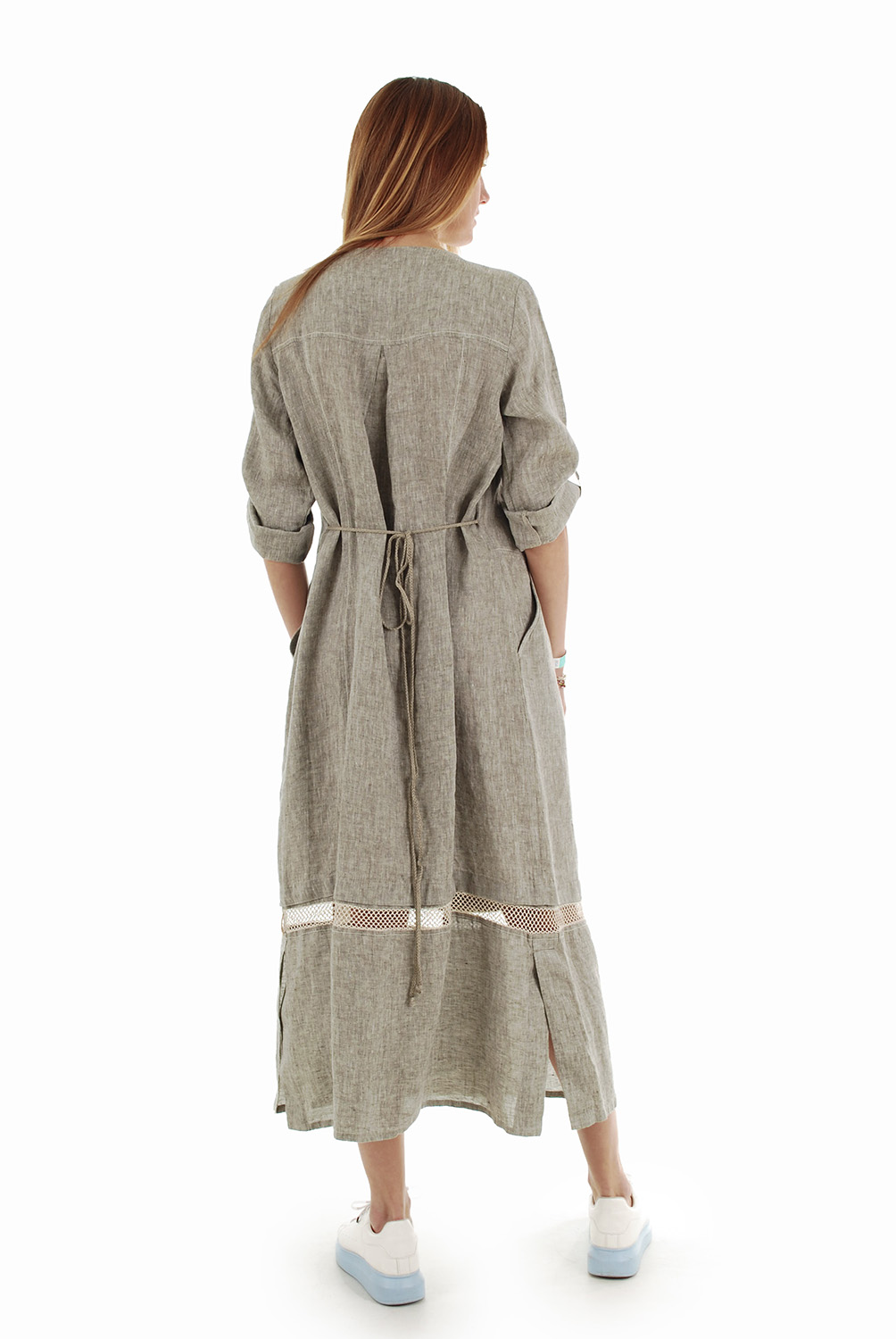 Ilga laisvo silueto lininė suknelė su ilgomis rankovėmis, kurios pasiraitoja iki ¾ ilgio. Puikiai tinka ir moterims turinčioms plačius klubus, o šonuose esantys skeltukai leidžia laisvai judėti. Dirželio dėka galima keisti suknelės siluetą.