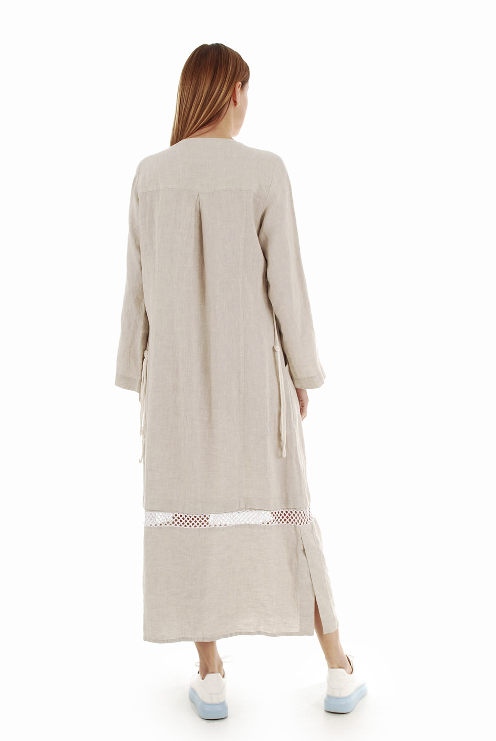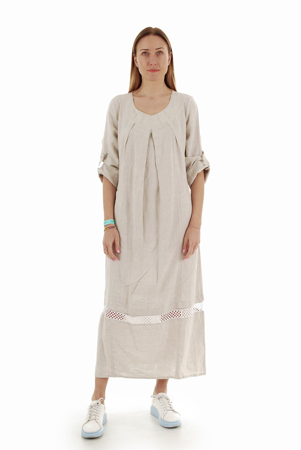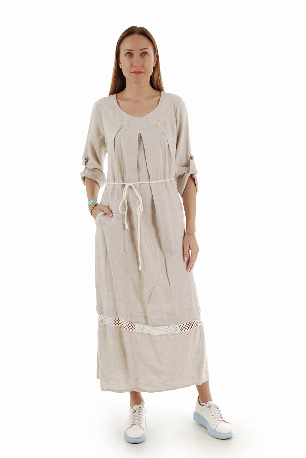 Ilga laisvo silueto lininė suknelė su ilgomis rankovėmis, kurios pasiraitoja iki ¾ ilgio. Puikiai tinka ir moterims turinčioms plačius klubus, o šonuose esantys skeltukai leidžia laisvai judėti. Dirželio dėka galima keisti suknelės siluetą.