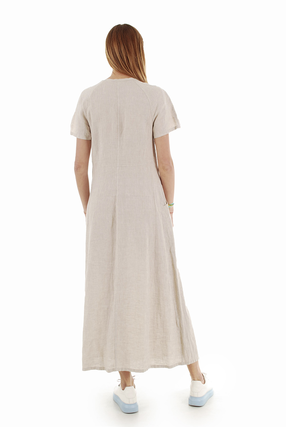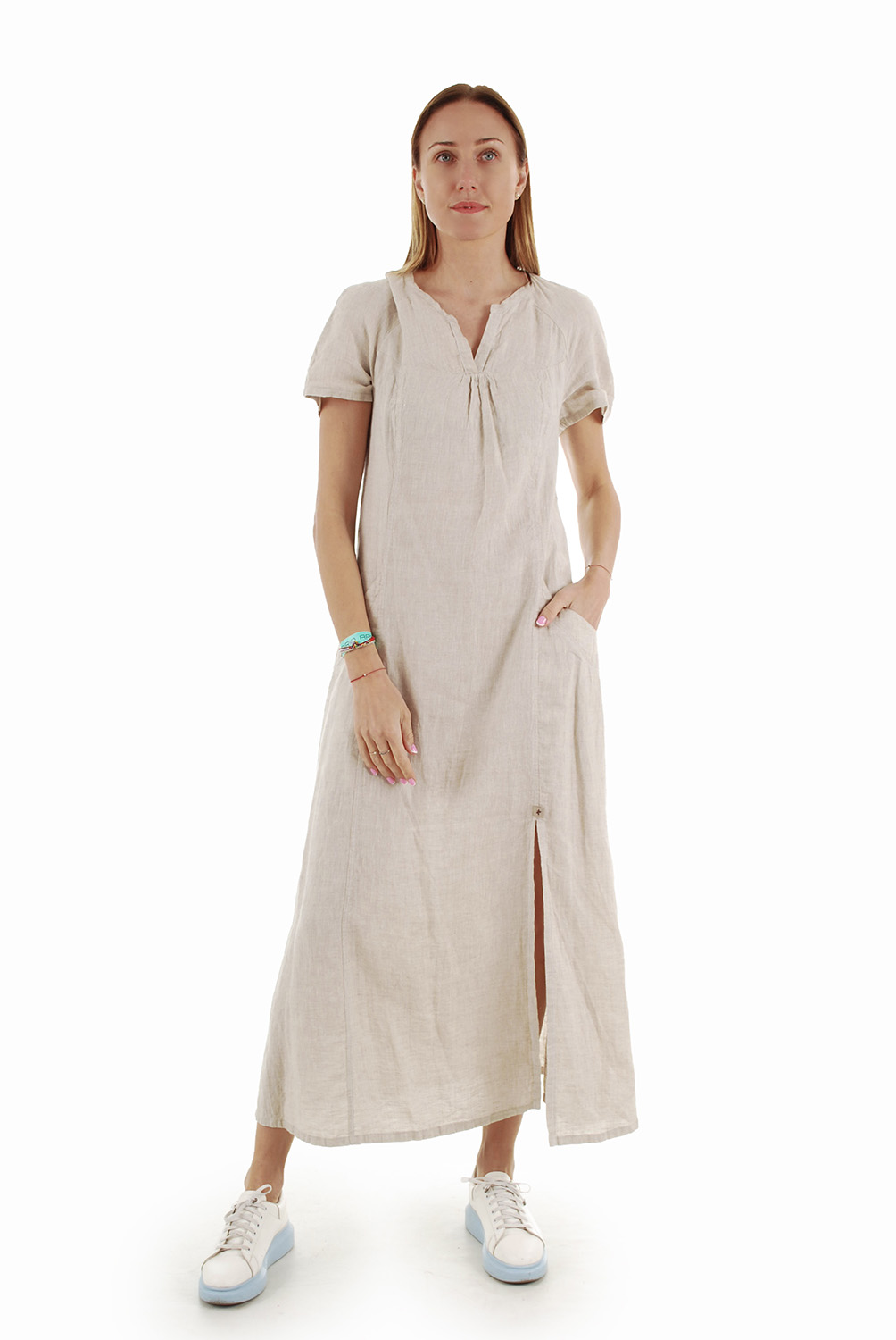 Elegantiška ilga lininė suknelė trumpomis rankovėmis. V formos kaklo iškirptė dekoruota klostelėmis, o šone esantis skeltukas suteikia šarmo ir leidžia laisvai judėti.
