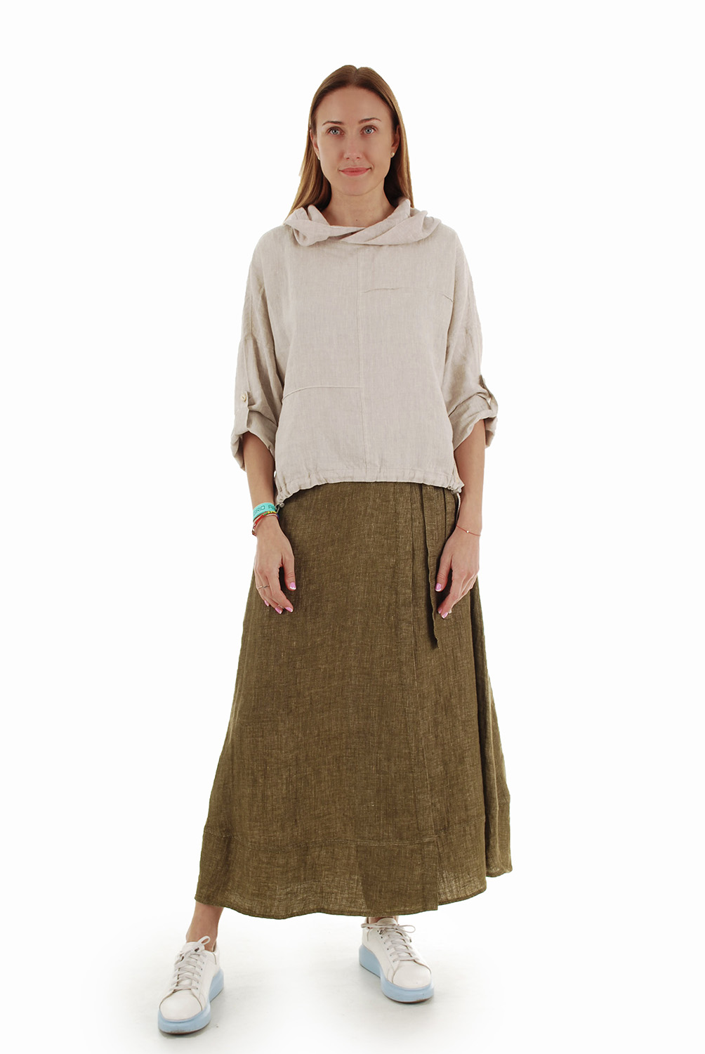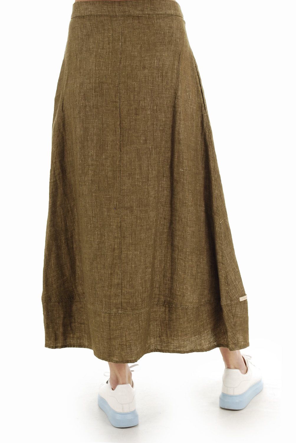 Ilgas, sujuosiamas lininis sijonas. Sijonas turi sagutes, kurių dėka galima keisti apimtį iki 10 centimetrų. Siluetas truputį siaurėjantis į apačią.