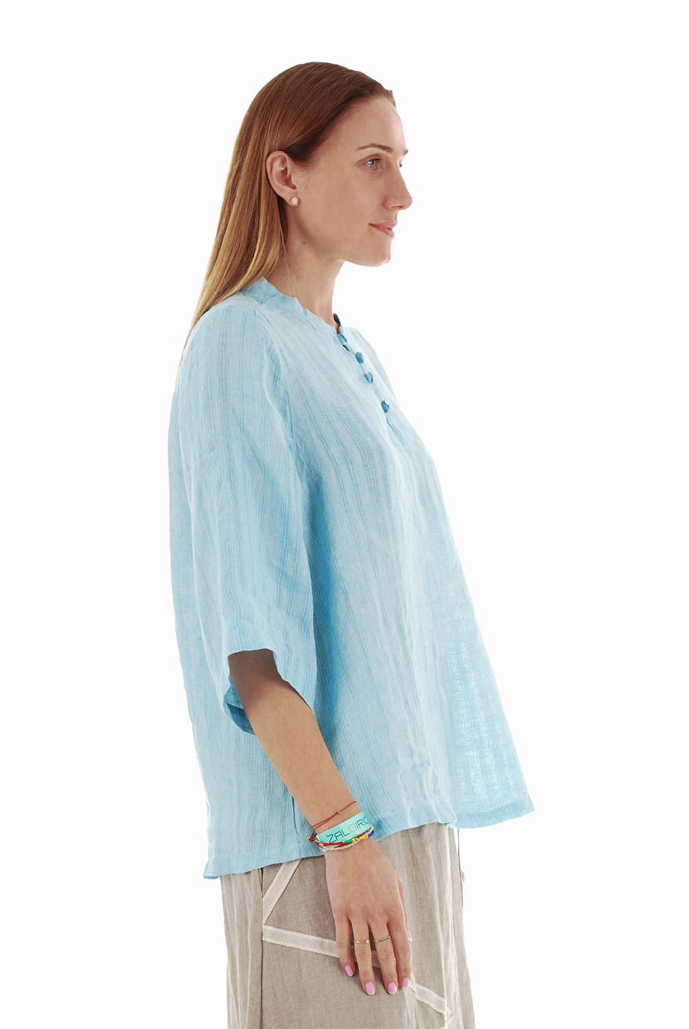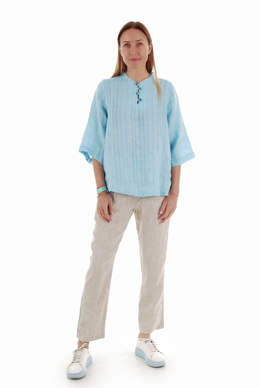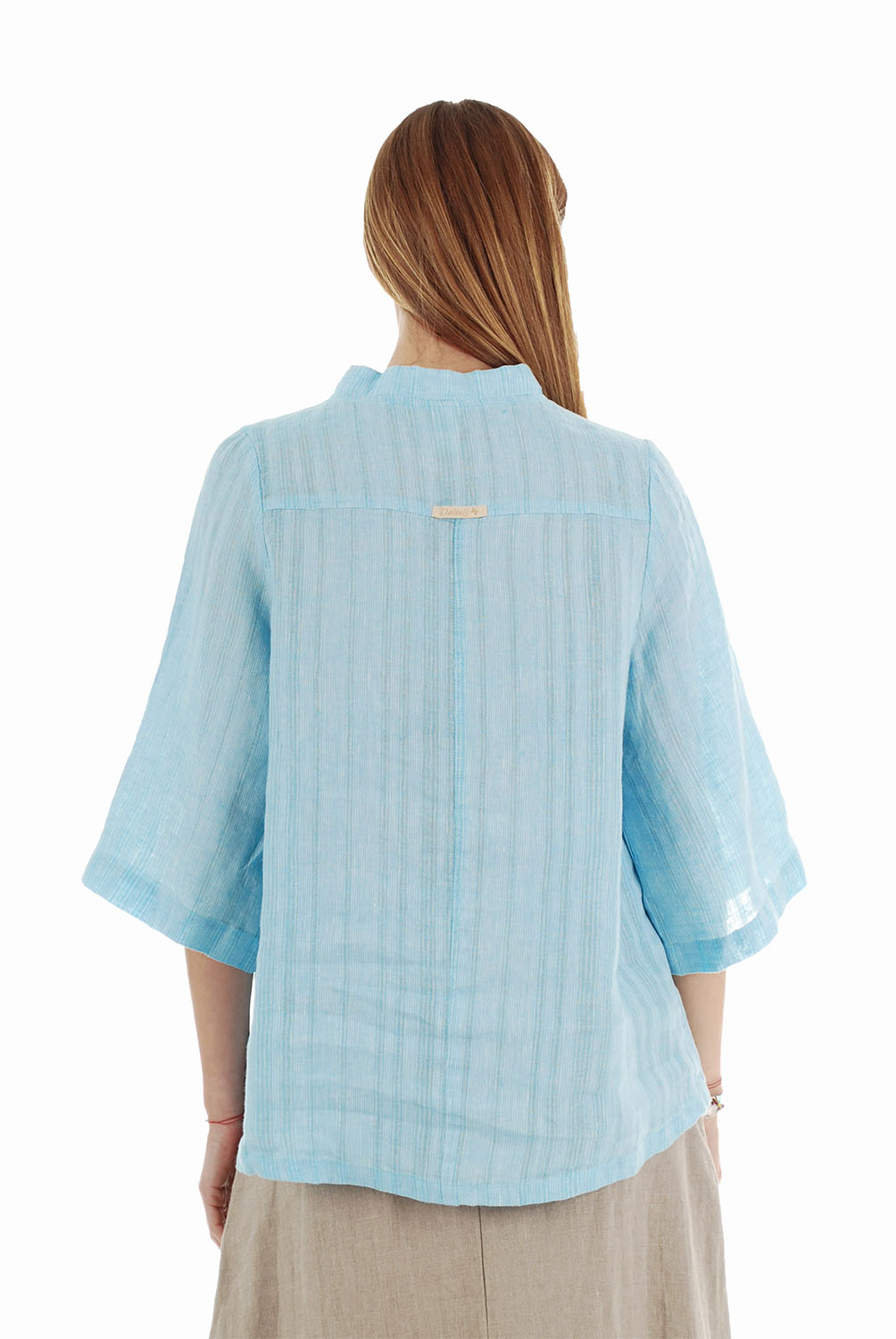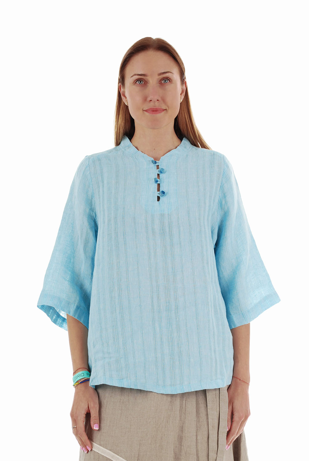 Laisva lininė palaidinė, pusilgėmis rankovėmis, žydra