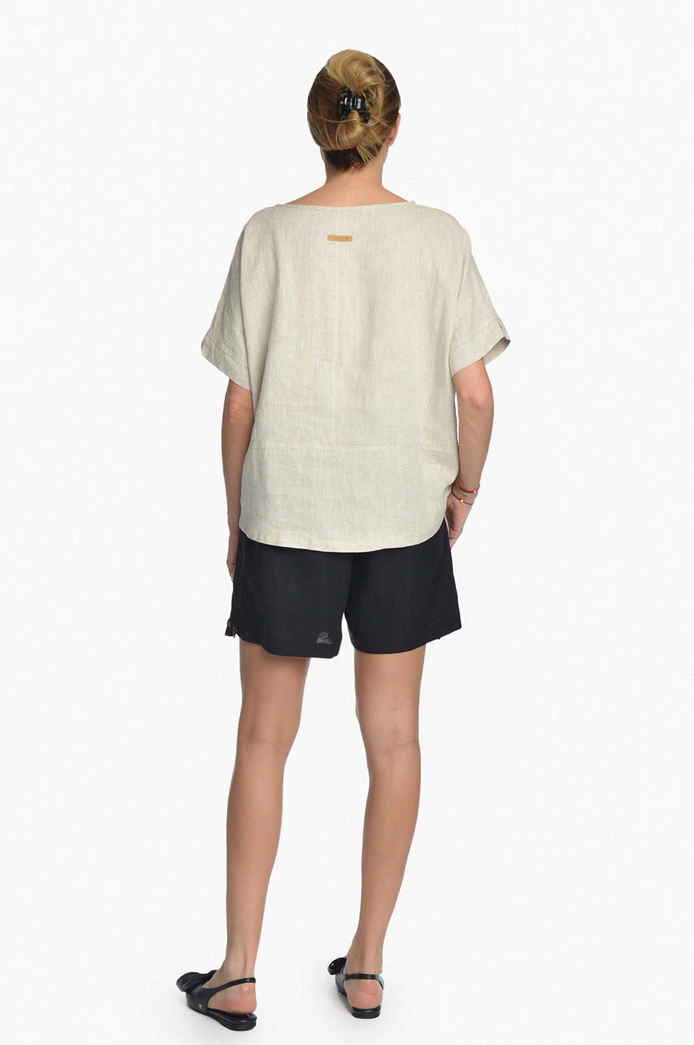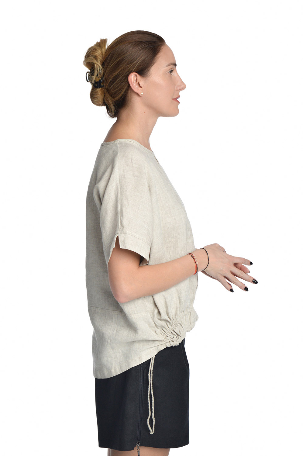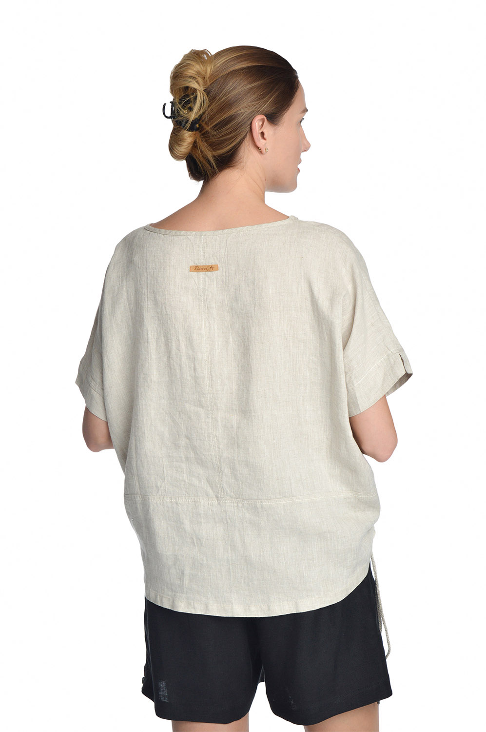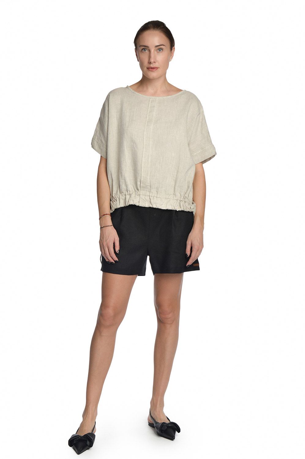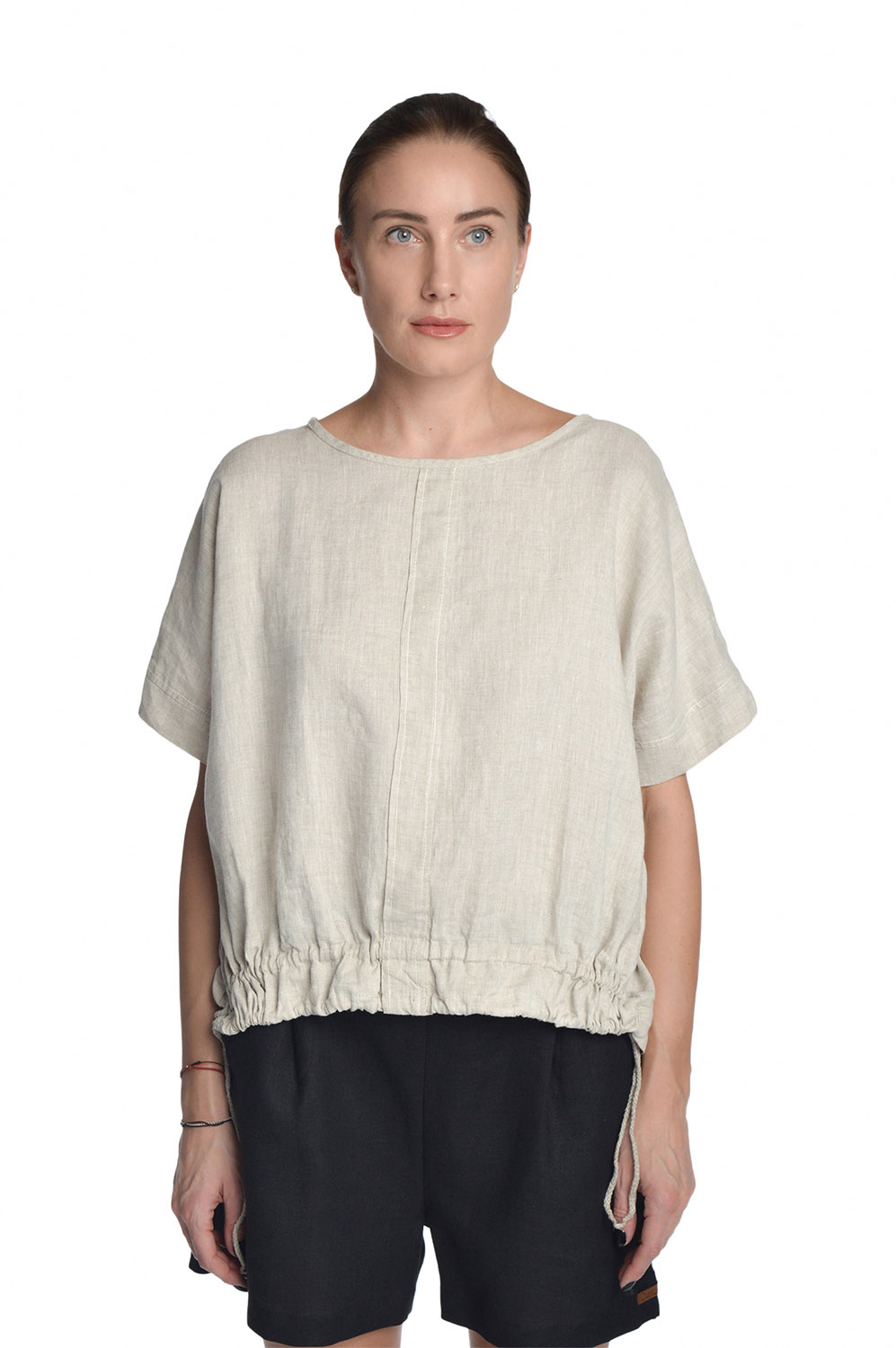 Laisvo stiliaus lininė palaidinė sutraukiama apačia. Kimono tipo trumpomis rankovėmis. Apačia susiaurinama sutraukiamomis ir užfiksuojamomis virvelėmis, taip reguliuojant palaidinės plotį.