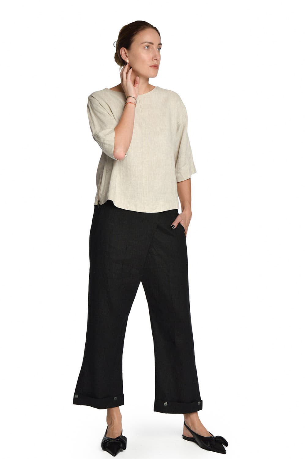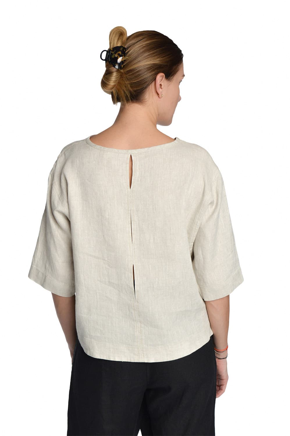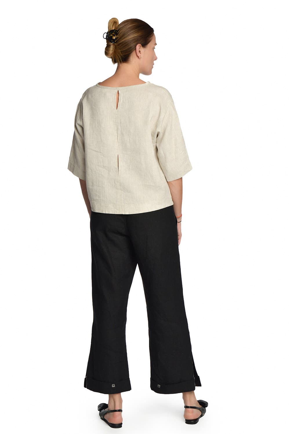 Palaidinė iš lino, lengvai platėjančio į apačią silueto. Įstatytomis, plačiomis, marškinėlių tipo rankovėmis. Palaidinės apačioje, šonuose, yra užtrauktukai, kuriuos atsegus, pasidaro skeltukai. Stilingas akcentas – storo siūlo peltakis.