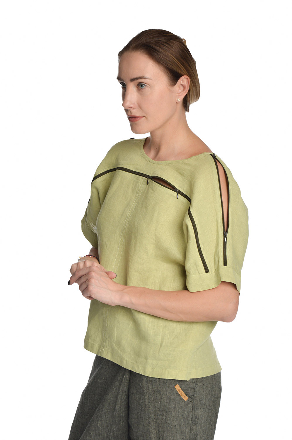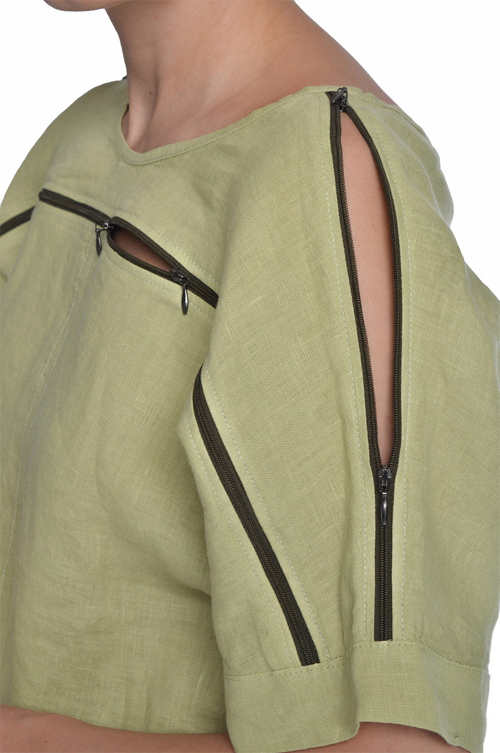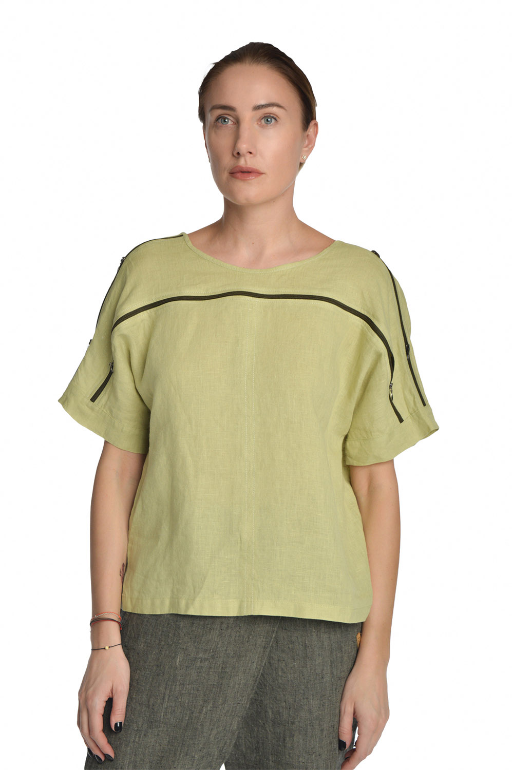 Lininė palaidinė trumpomis rankovėmis su užtrauktuku pečių linijoje, žalia