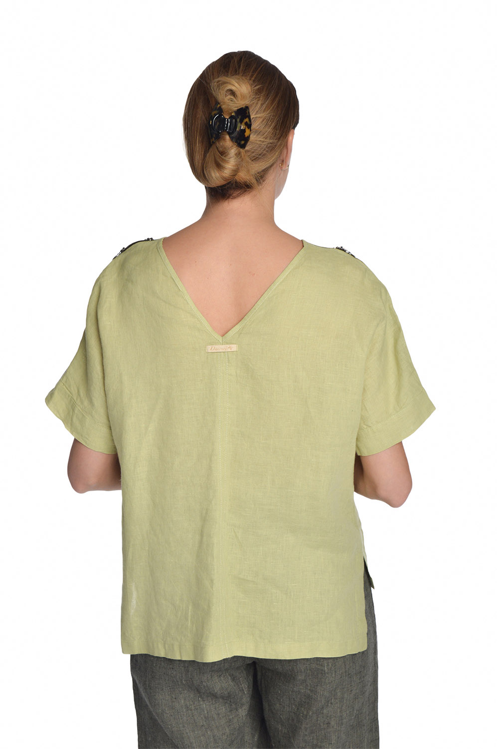 Tiesaus silueto moteriška palaidinė iš lino. Kimono tipo trumpomis rankovėmis, prailginto laivelio kaklu ir V formos iškirpte nugaroje. Stilingas, funkcionalus dekoras – užsegami užtrauktukai virš krūtinės ir pečių linijoje.