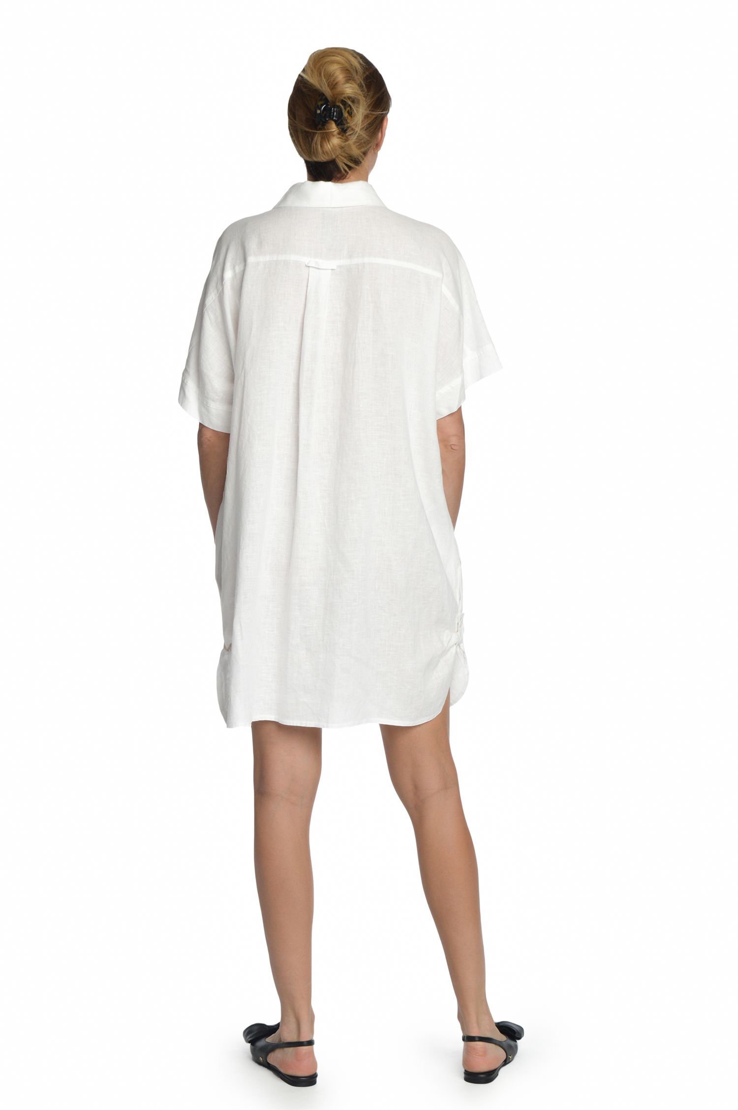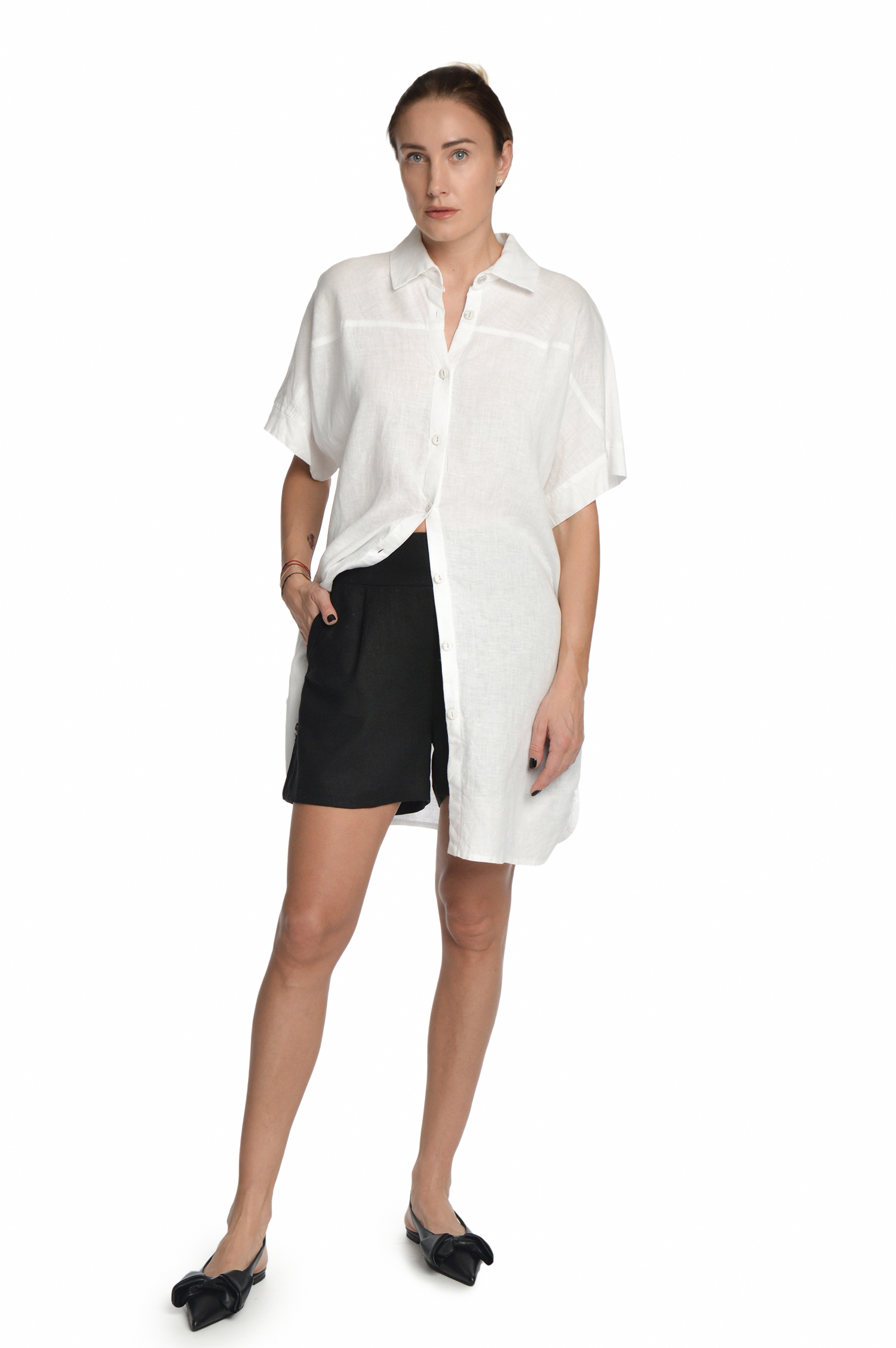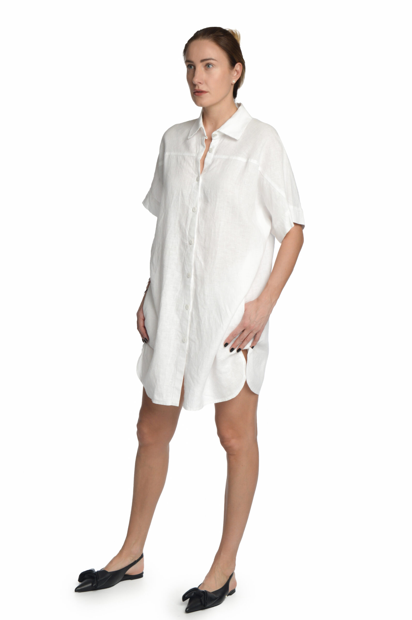 Laisvo silueto, marškinių tipo lininė suknelė, užsagstoma priekyje per visą ilgį. Galima dėvėti vieną arba su šortais, kelnėmis, sijonu. Pridedamas dirželis.