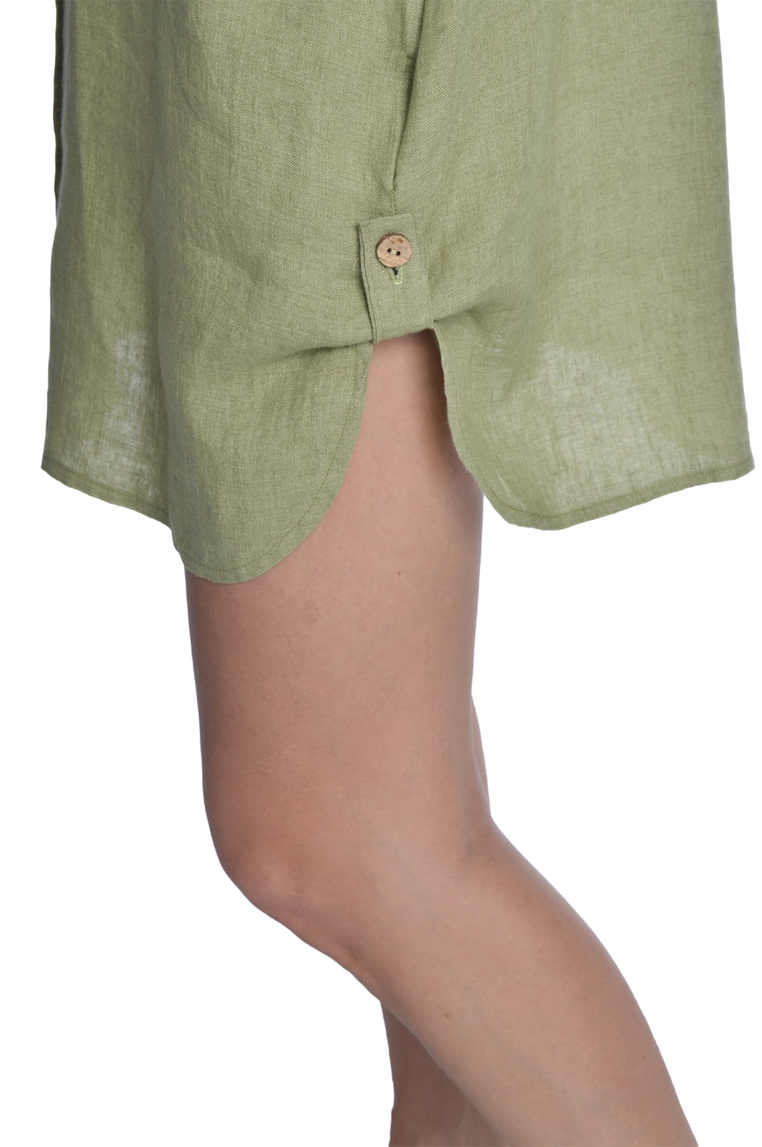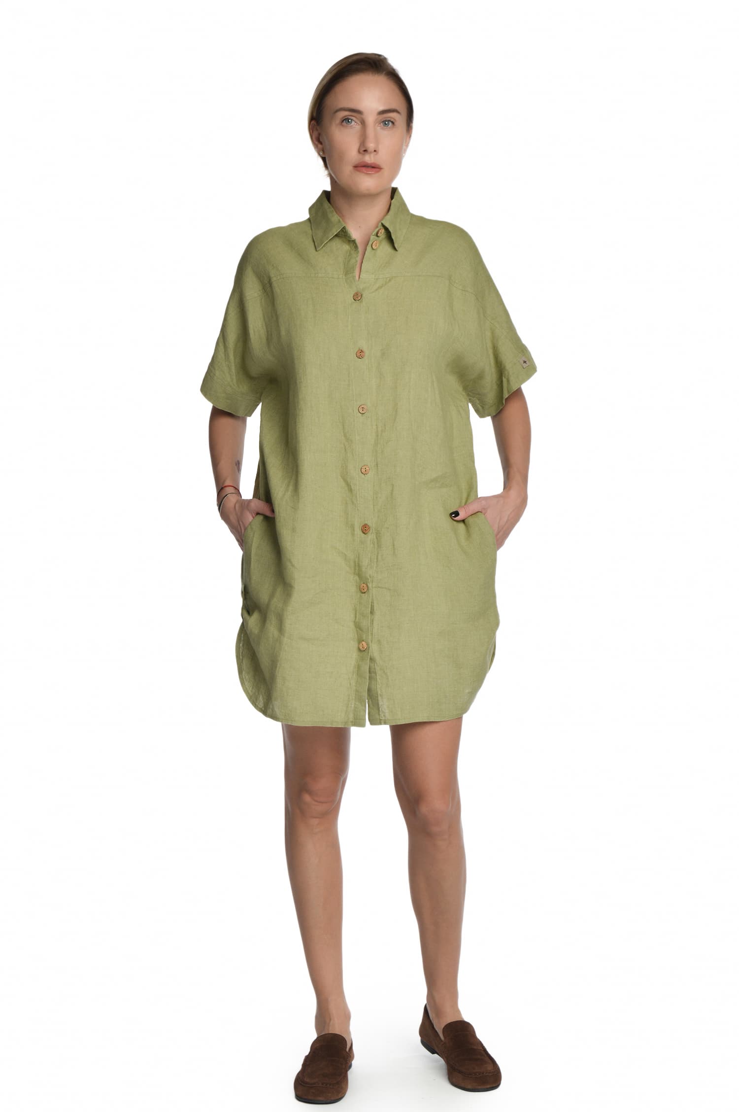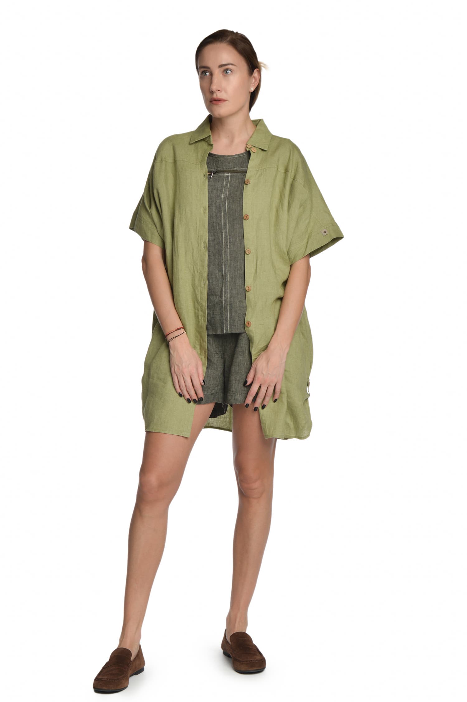 Laisvo silueto, marškinių tipo lininė suknelė, užsagstoma priekyje per visą ilgį. Galima dėvėti vieną arba su šortais, kelnėmis, sijonu. Pridedamas dirželis.