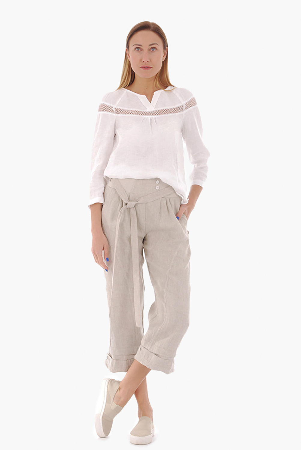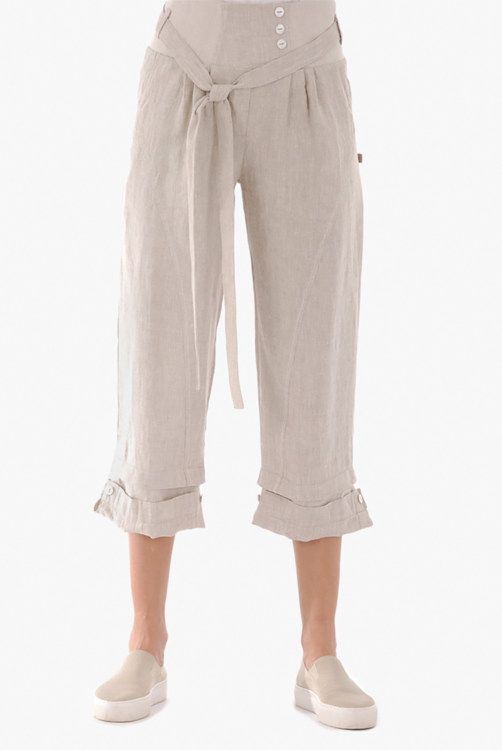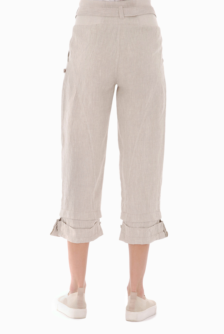 Moteriški lininiai bridžai, kurių juosmuo siūtas iš lininio audinio su elastanu. Lininių kelnių ilgį galima koreguoti apačioje esančiomis sagutėmis. Pridedamas lininis dirželis.