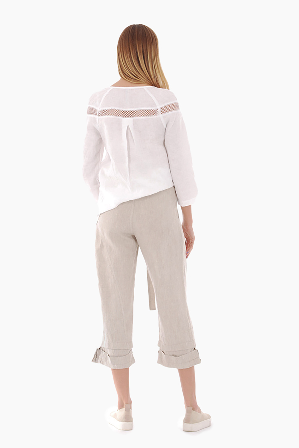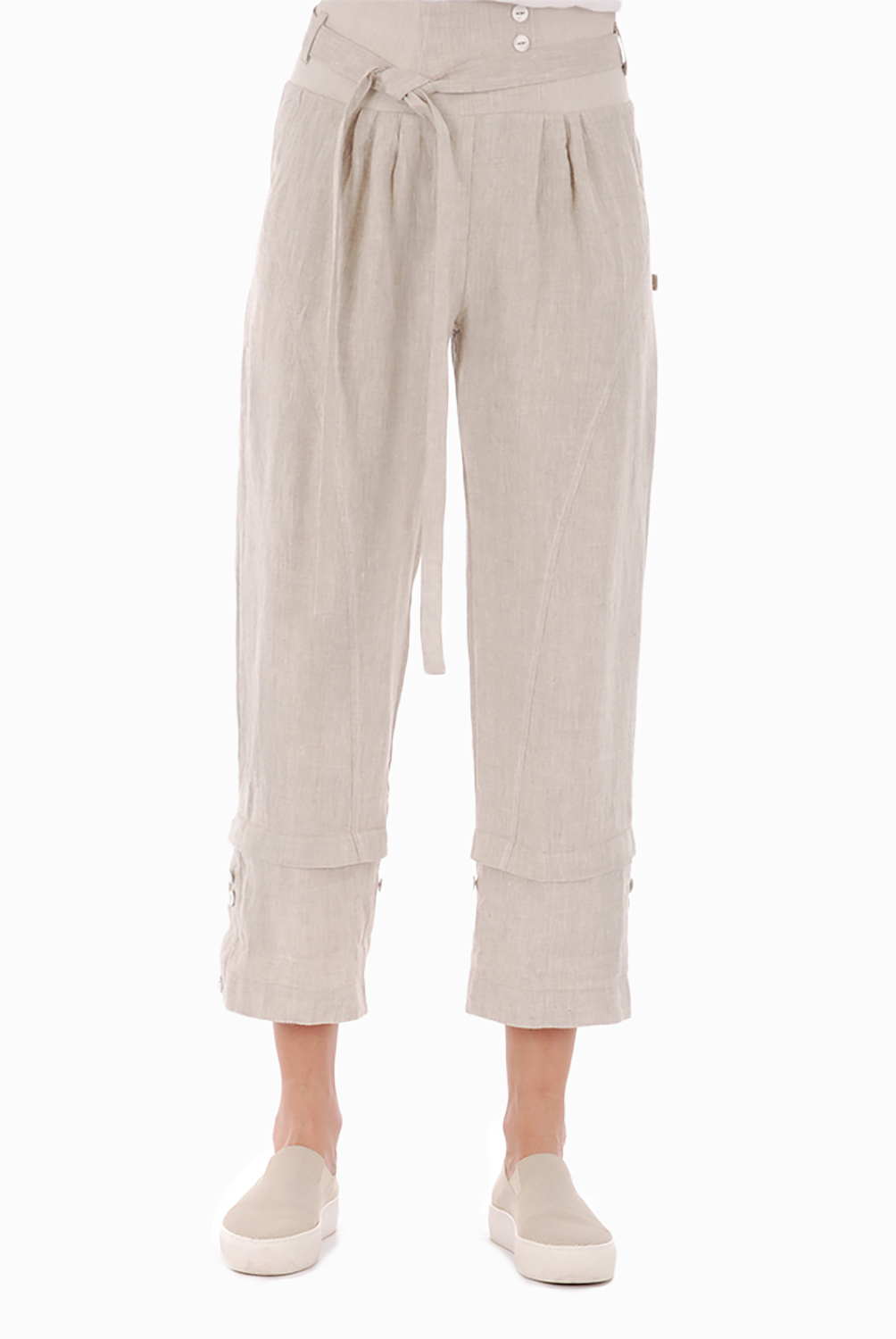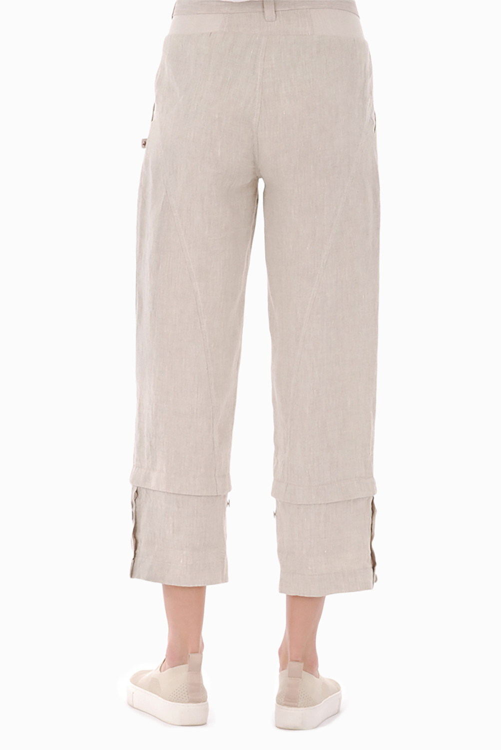 Lininių kelnių ilgį galima koreguoti apačioje esančiomis sagutėmis