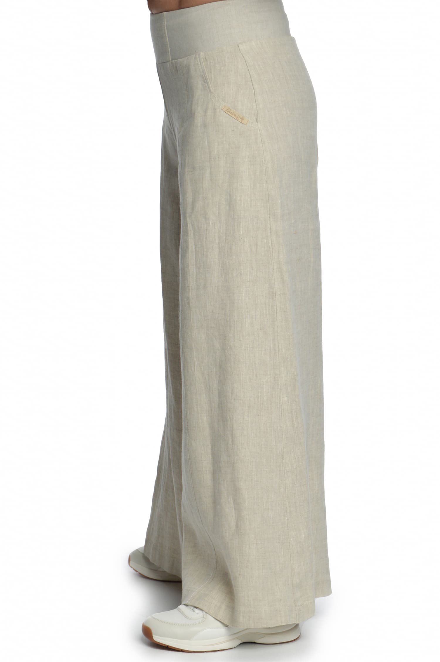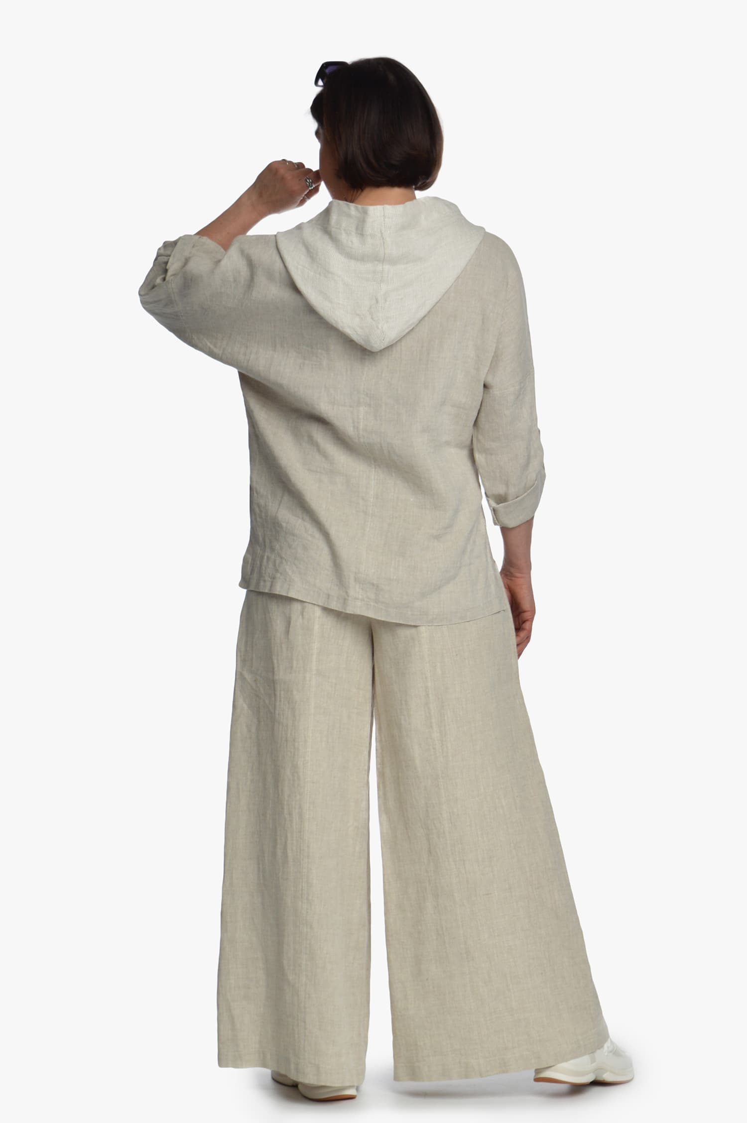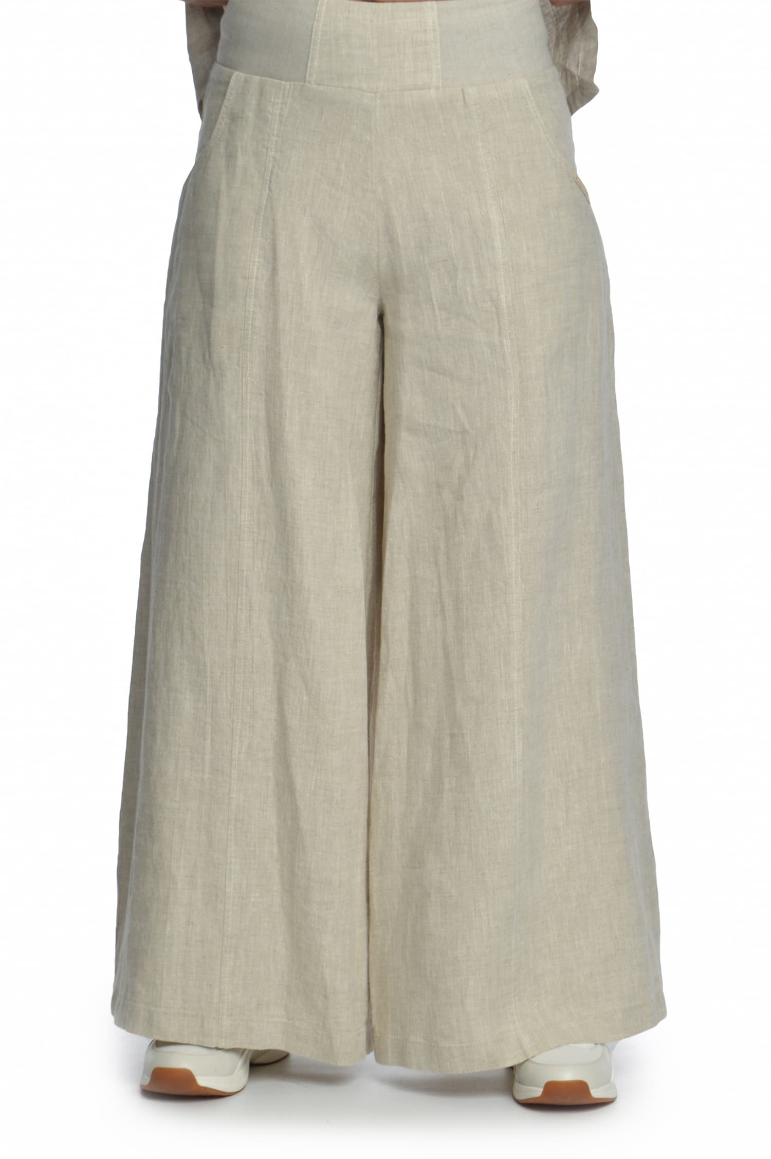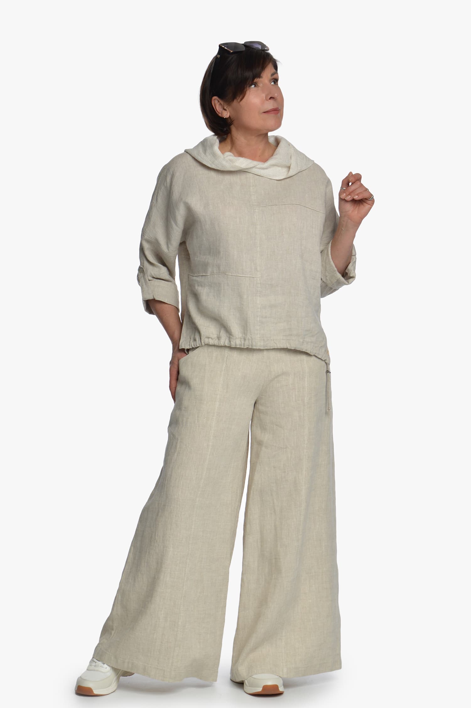 Lininės sijonkelnės plataus kirpimo. Juosmuo – linas su elastanu, kuris puikiai prisitaiko pagal liemens apimtį. Ties klubais prigludusios, o į apačią platėjančios – vizualiai atrodo kaip sijonas. Puoštos vertikaliomis siūlėmis su storo siūlo peltakiais.