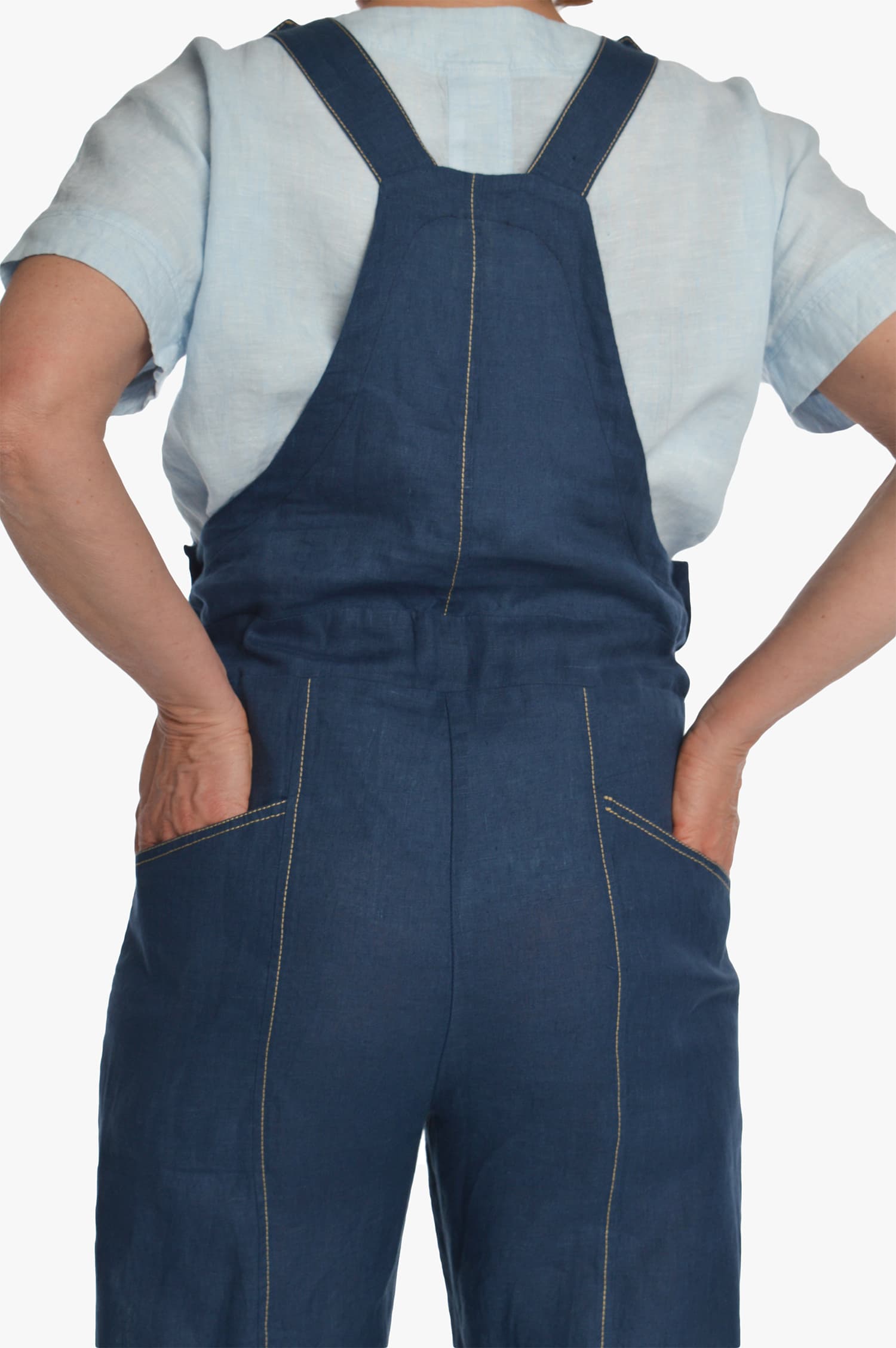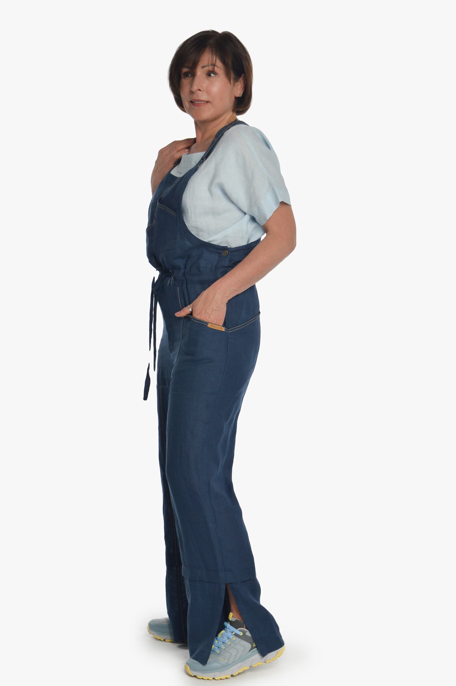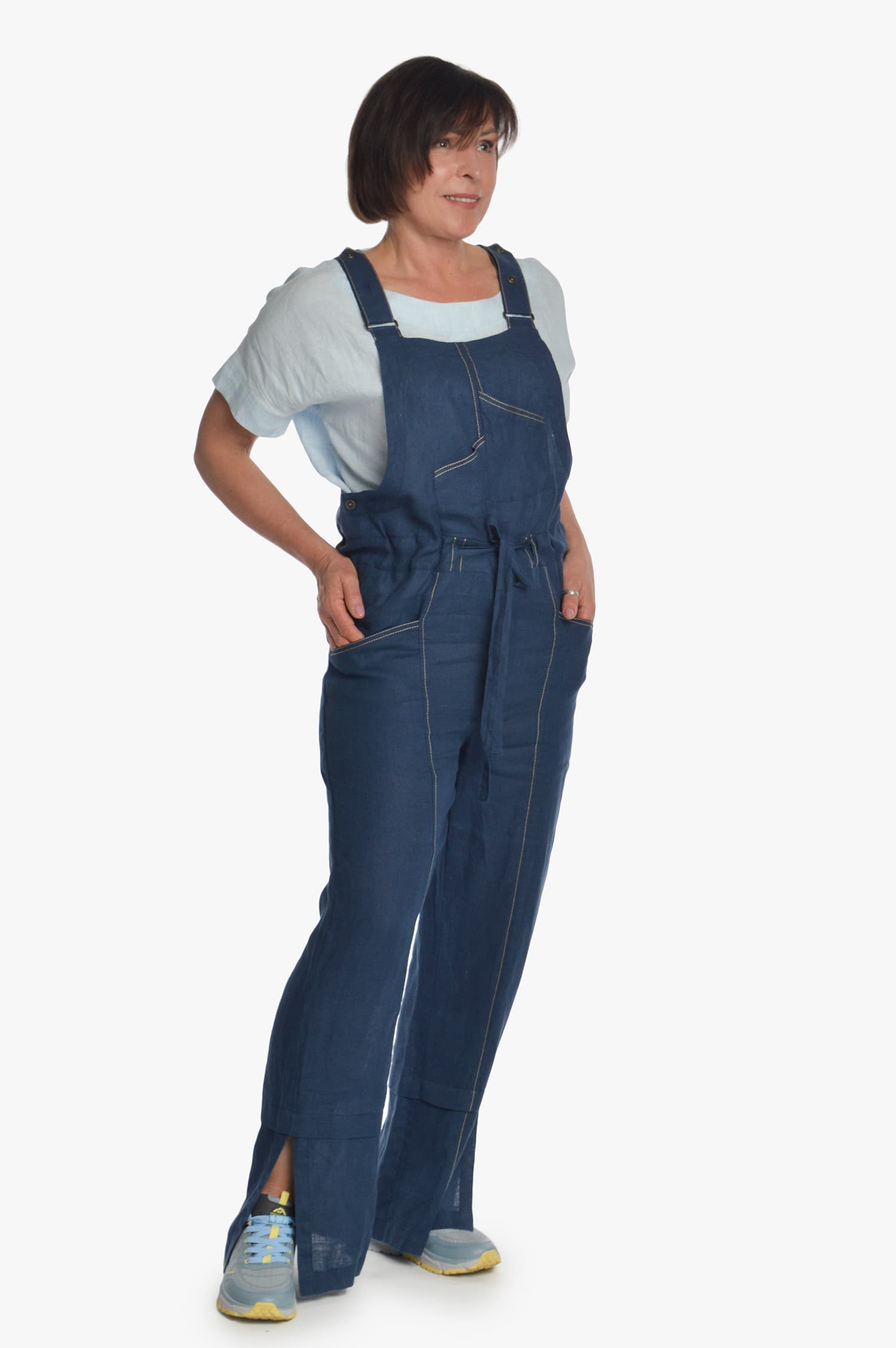 Laisvo stiliaus moteriškas lininis kombinezonas. Ilgis reguliuojamas petnešų sagų ir kilpų pagalba. Apačioje yra skeltukai ir užsiūtas atkankas, kurį išardžius galima prailginti kelnių ilgį, o užsiuvus – patrumpinti.