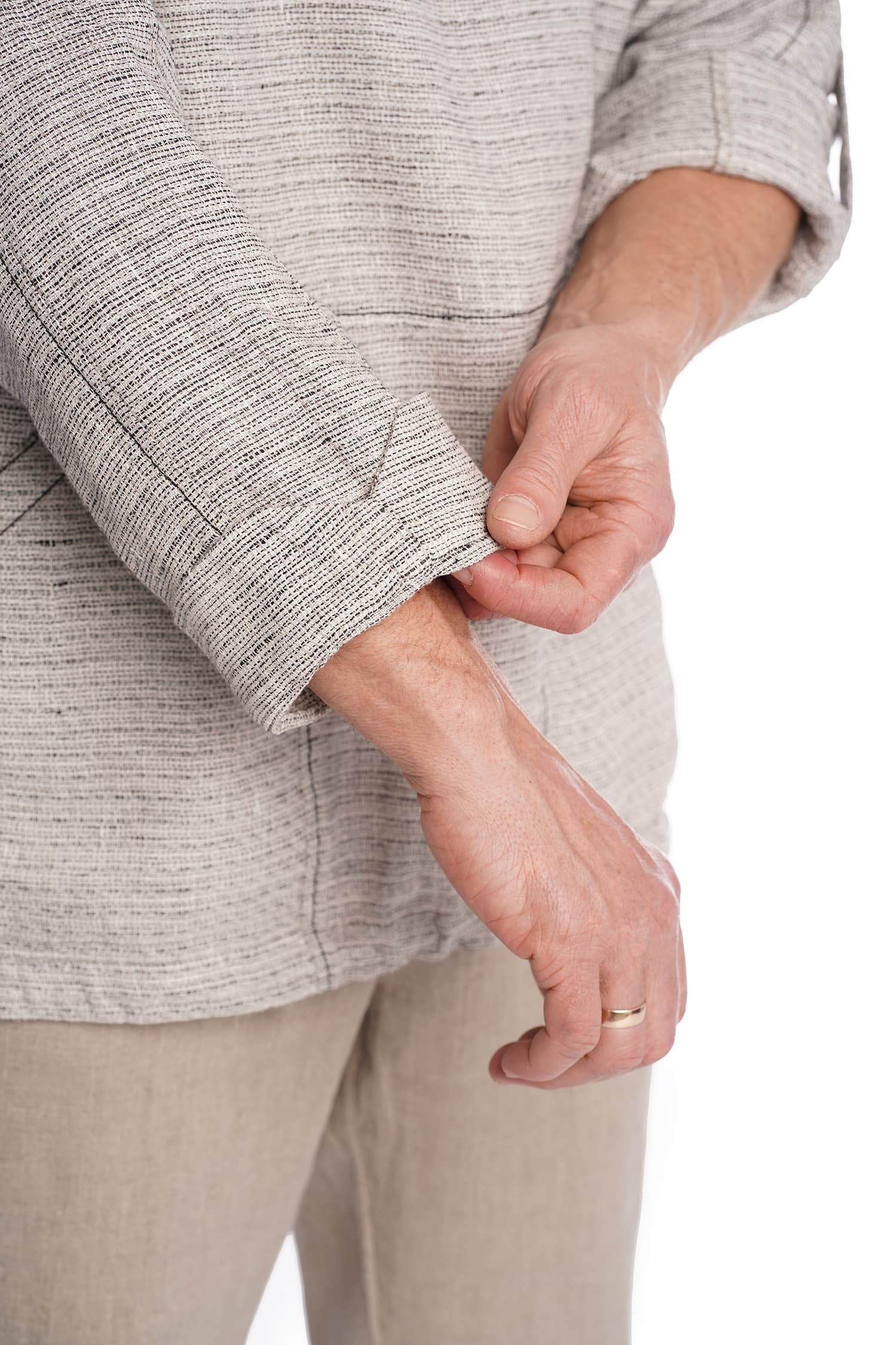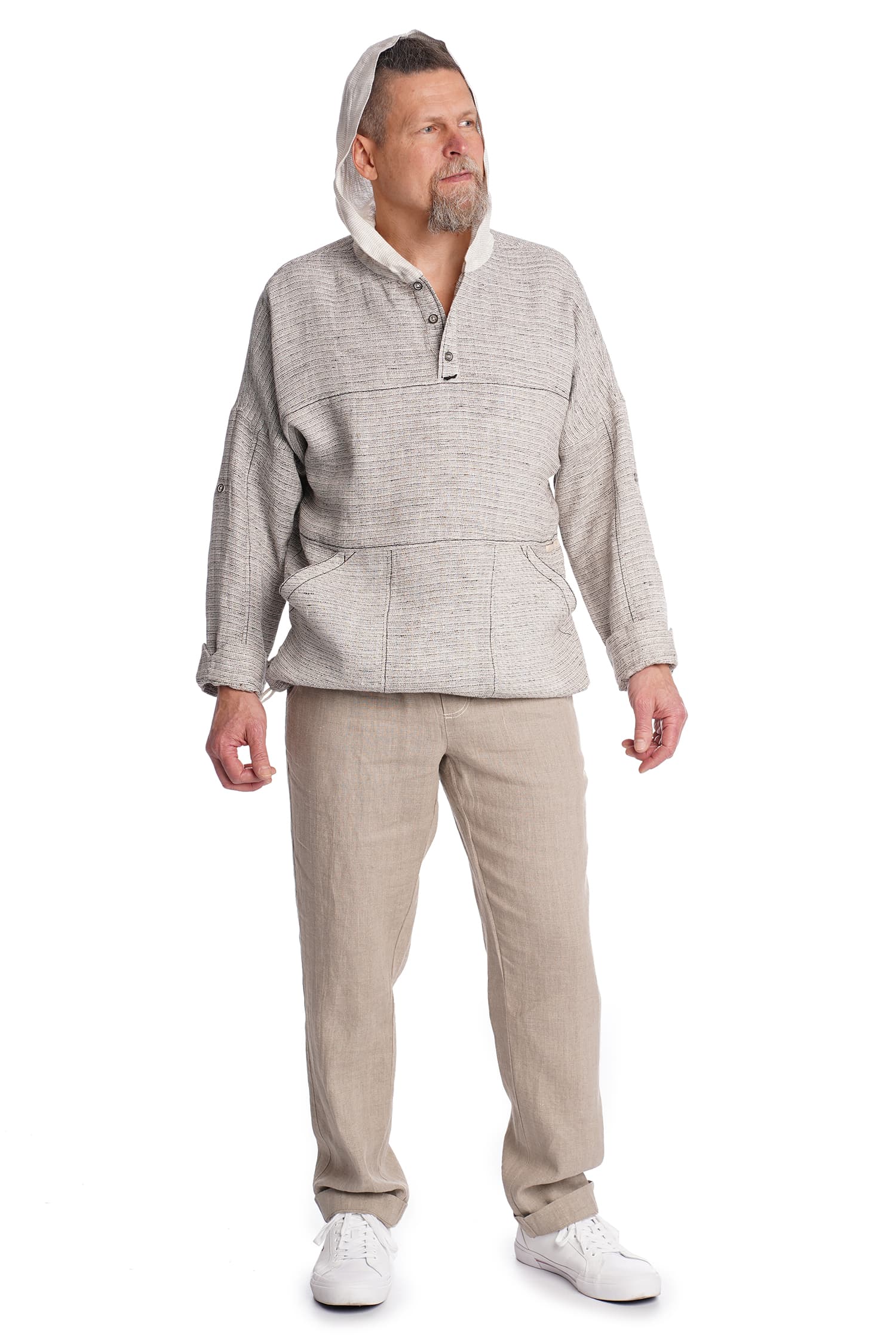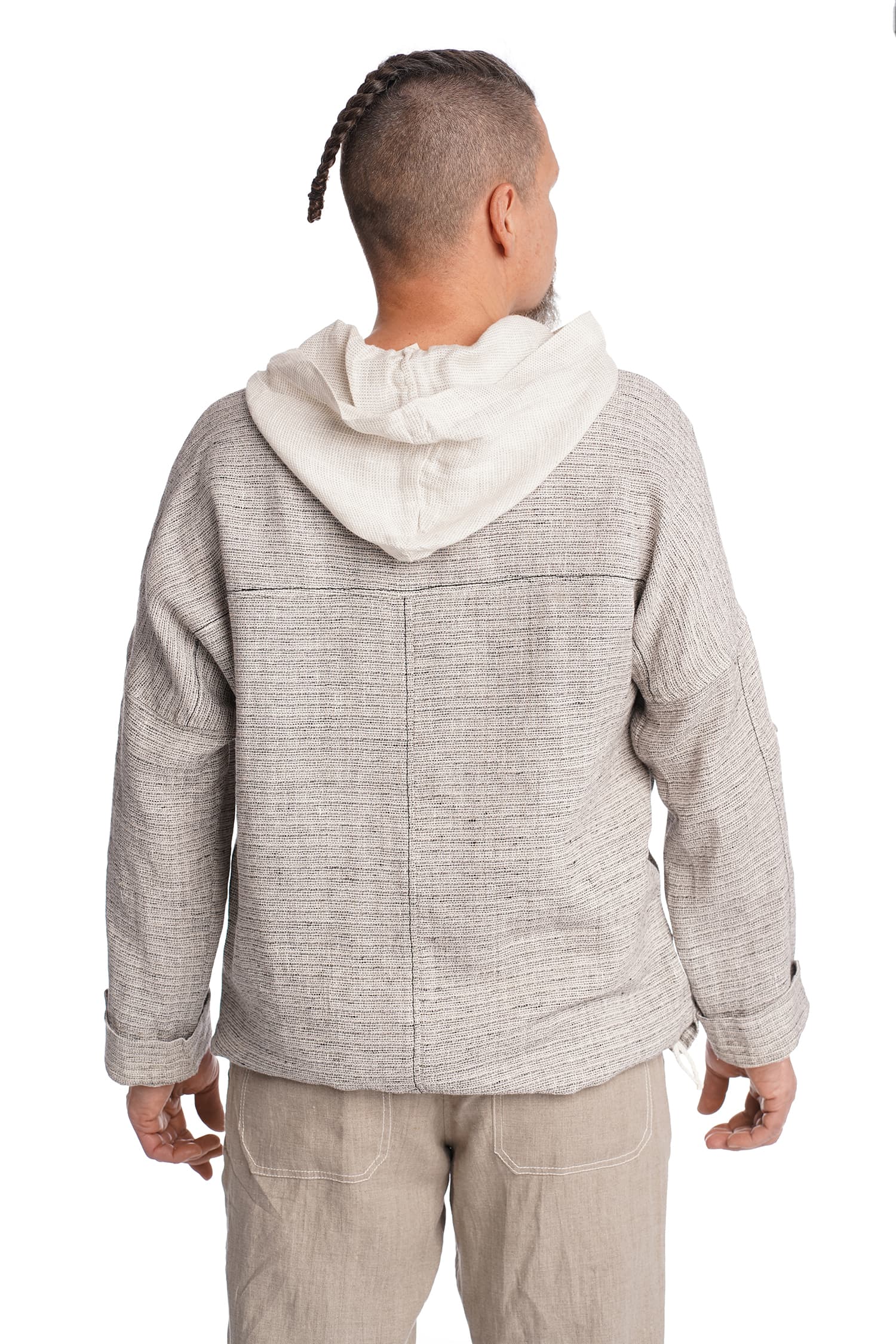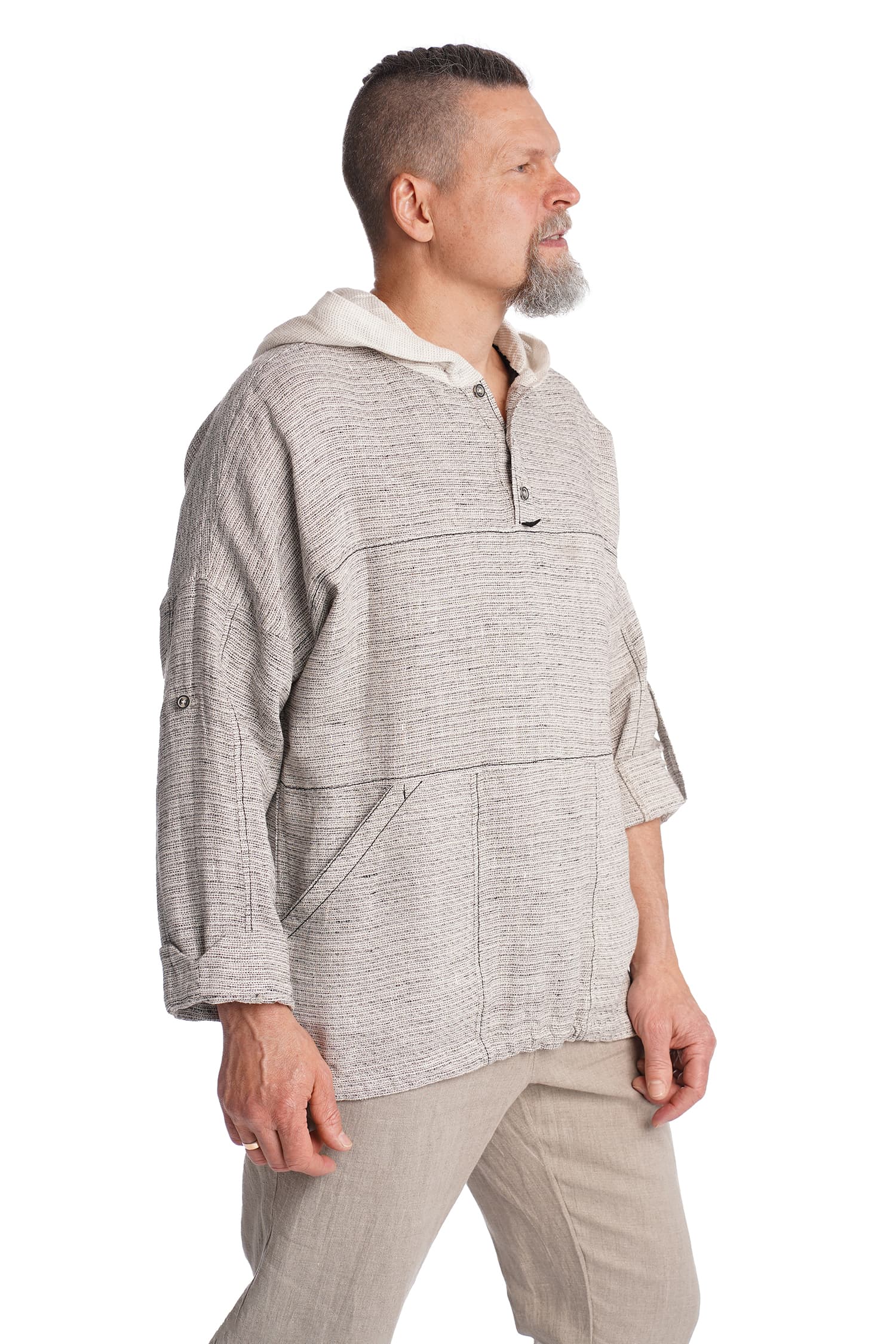 Lininis laisvo stiliaus bliuzonas su gobtuvu, baltai juodo melanžo spalvos