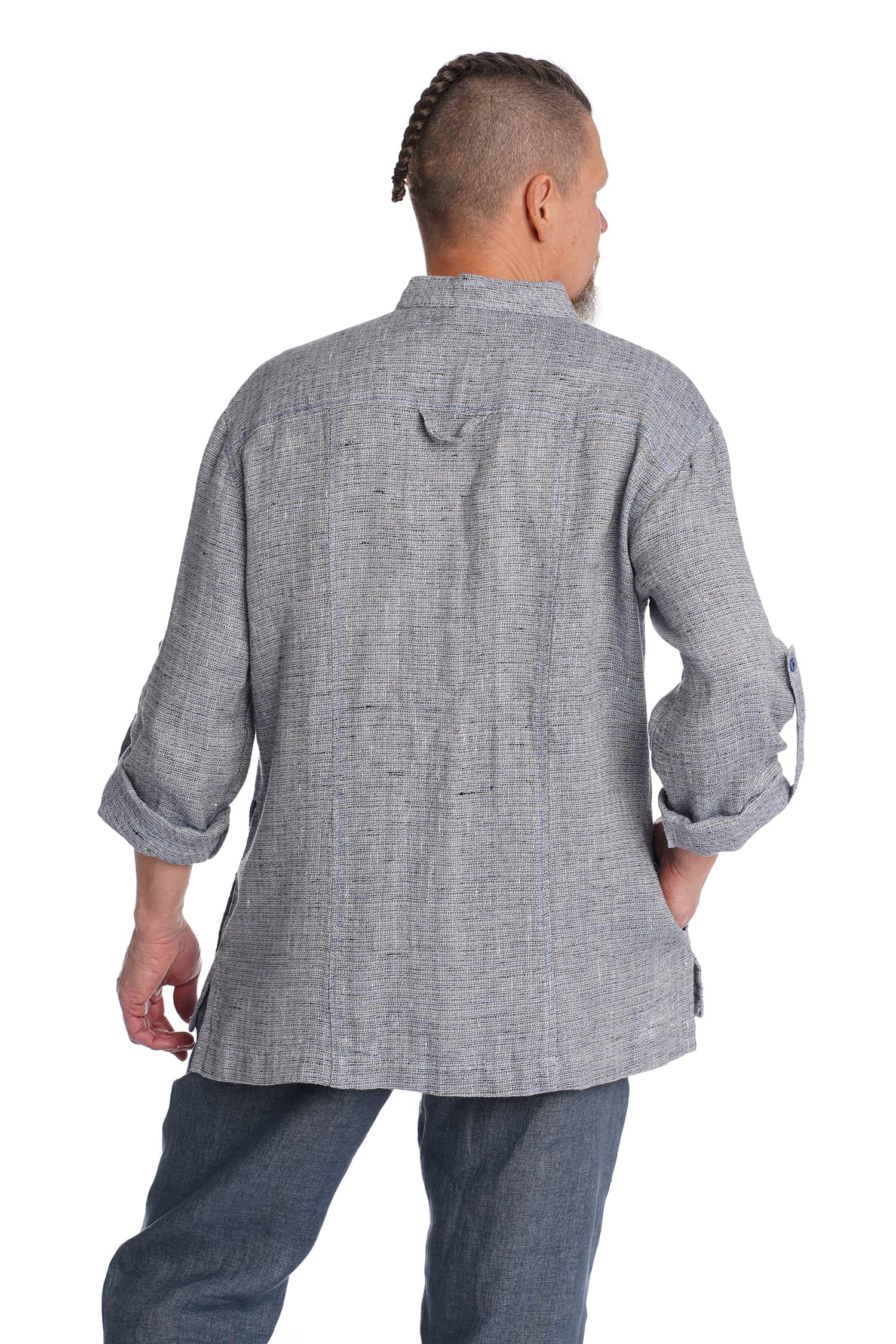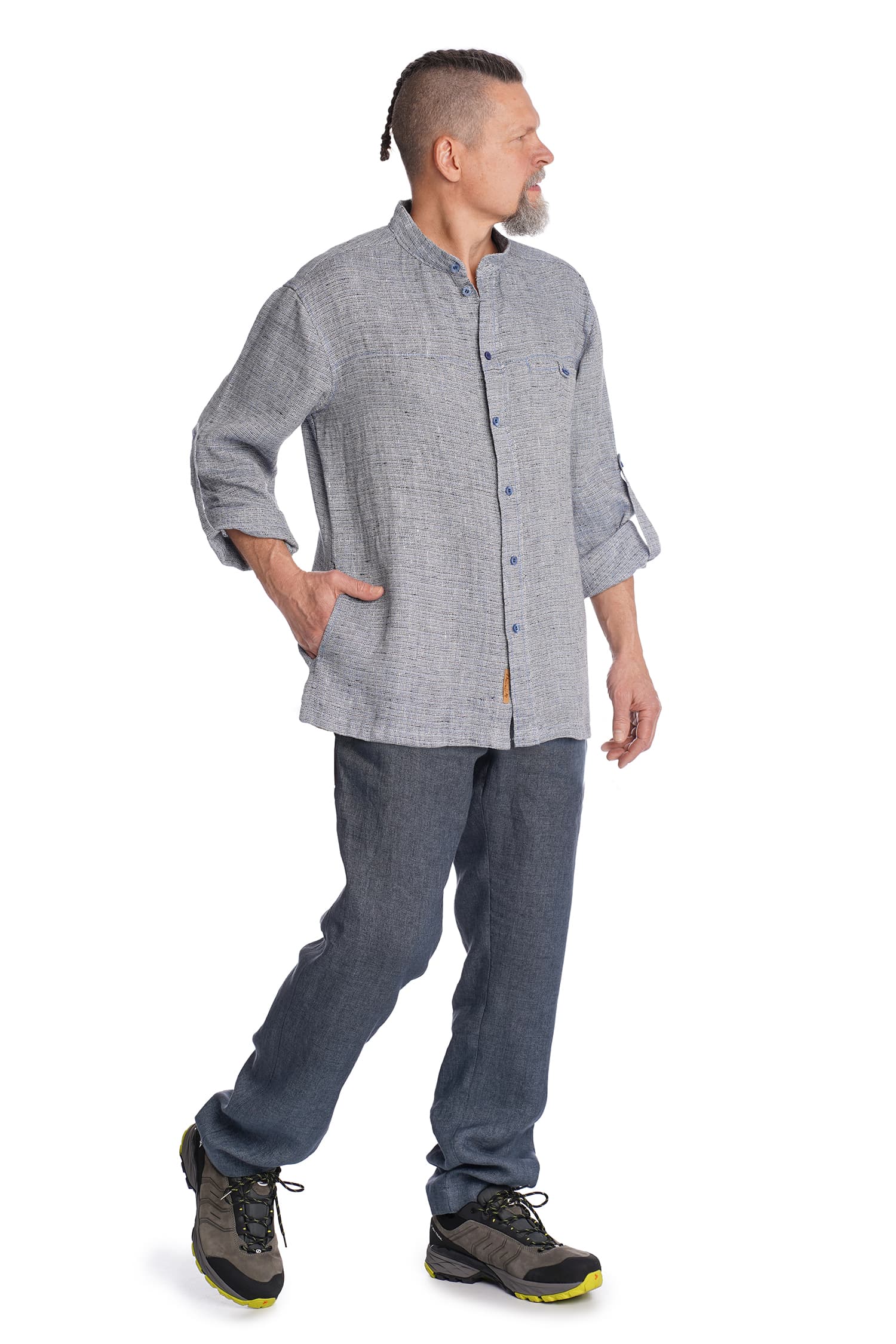 Priekyje susagstomi marškiniai-švarkas, pasiūti iš storesnio lino – puikiai tinka dėvėti vėsiais vasaros vakarais kaip viršutinis drabužis