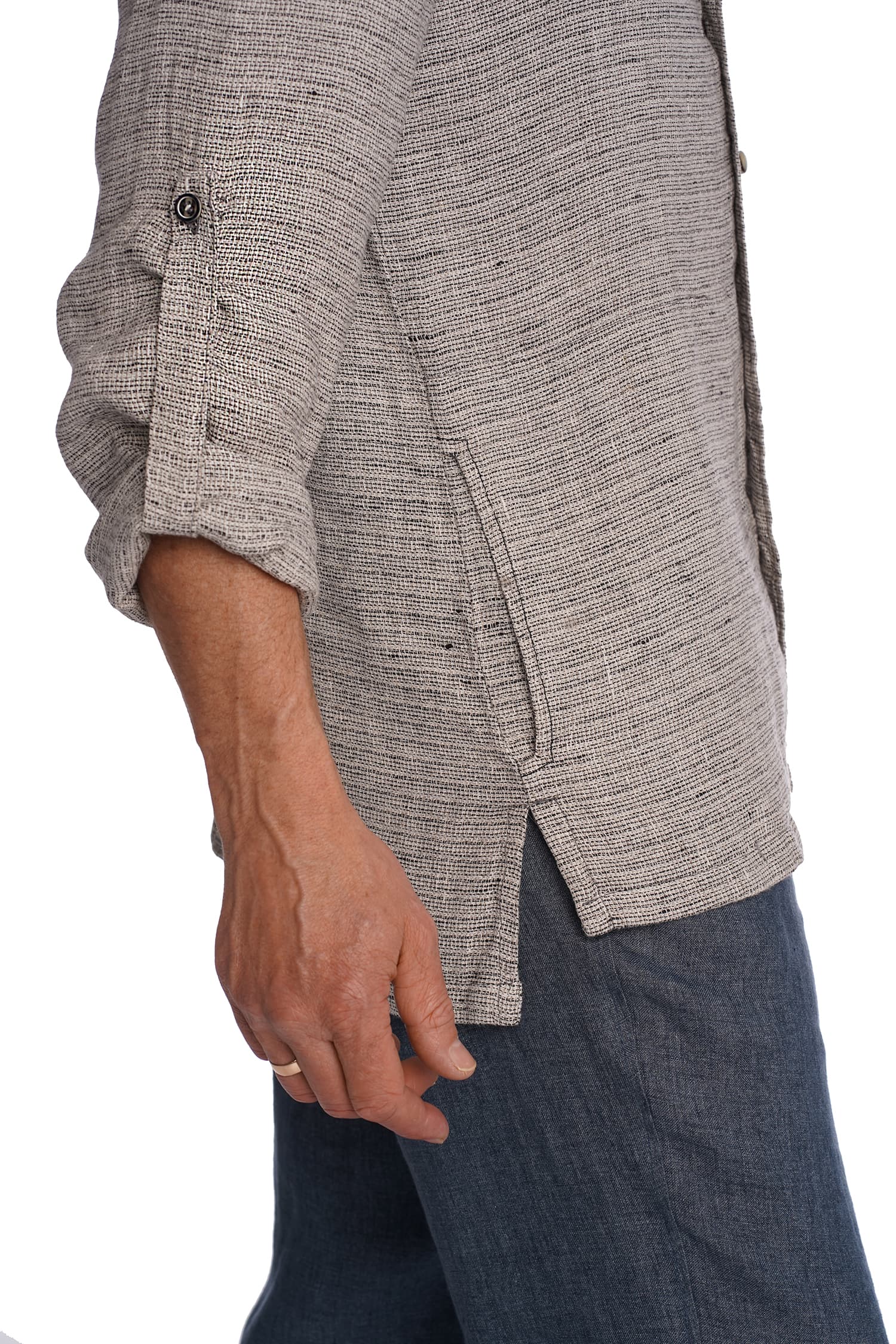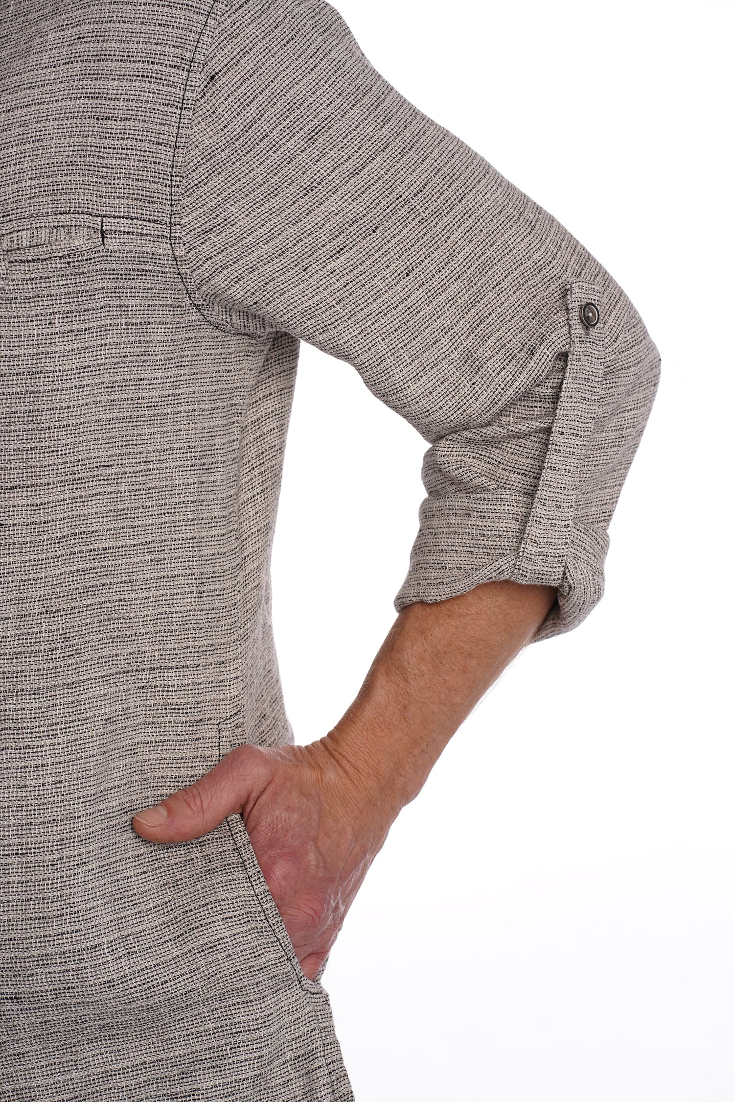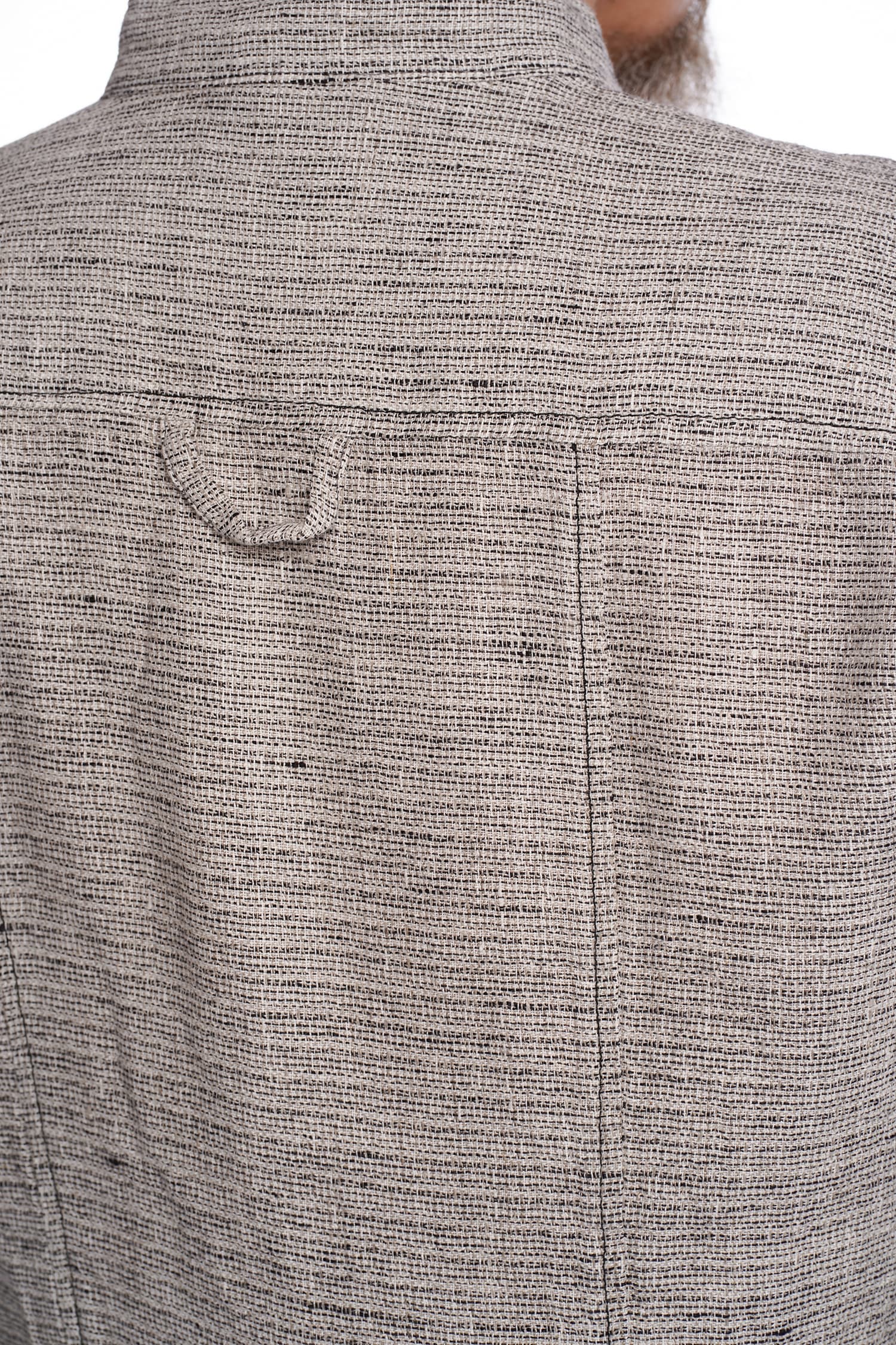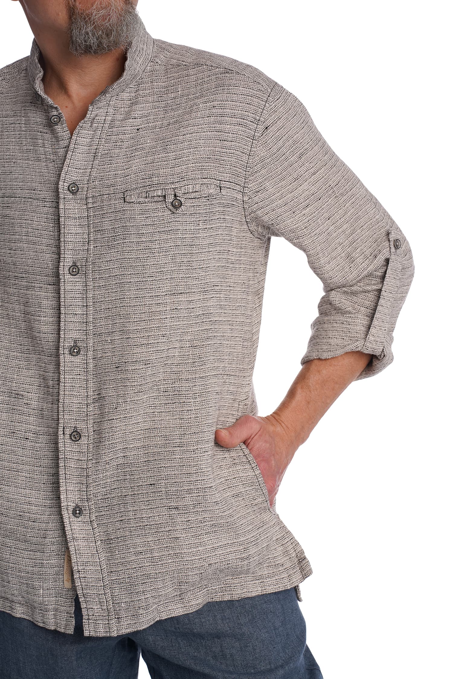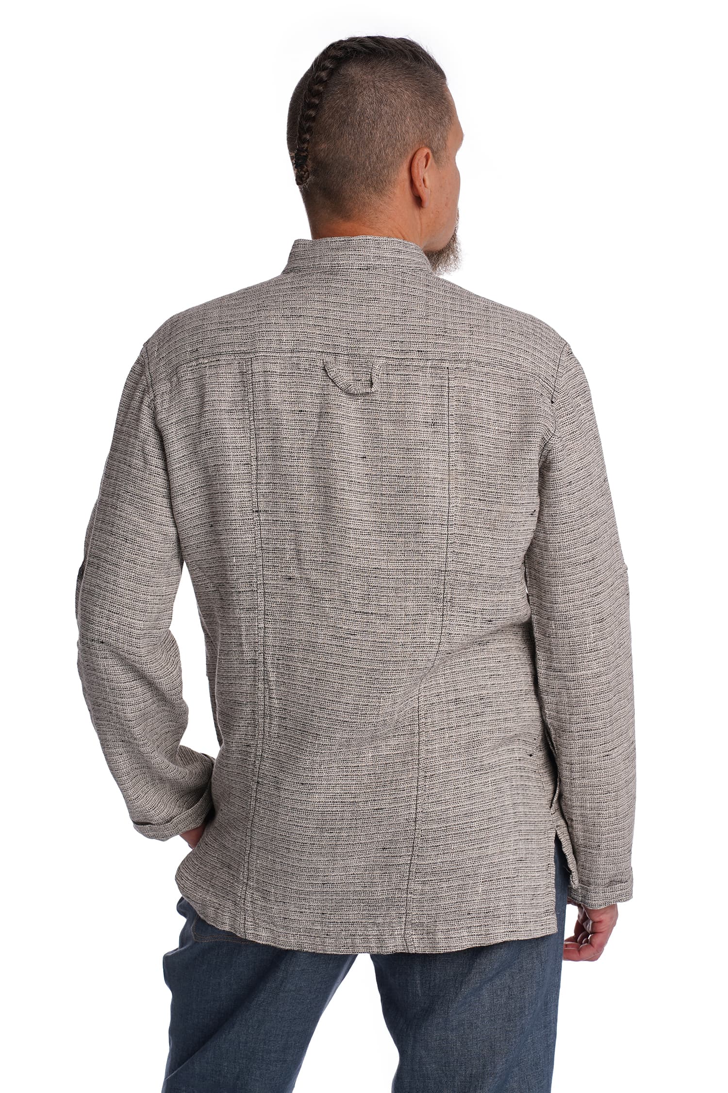 Priekyje susagstomi marškiniai-švarkas, pasiūti iš storesnio lino – puikiai tinka dėvėti vėsiais vasaros vakarais kaip viršutinis drabužis