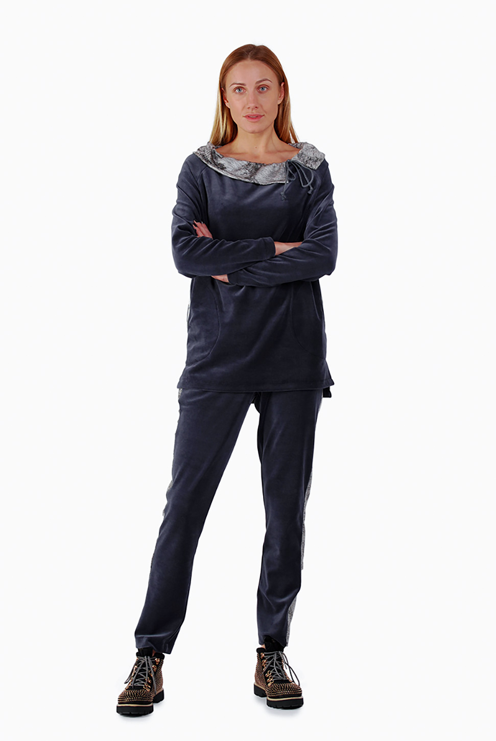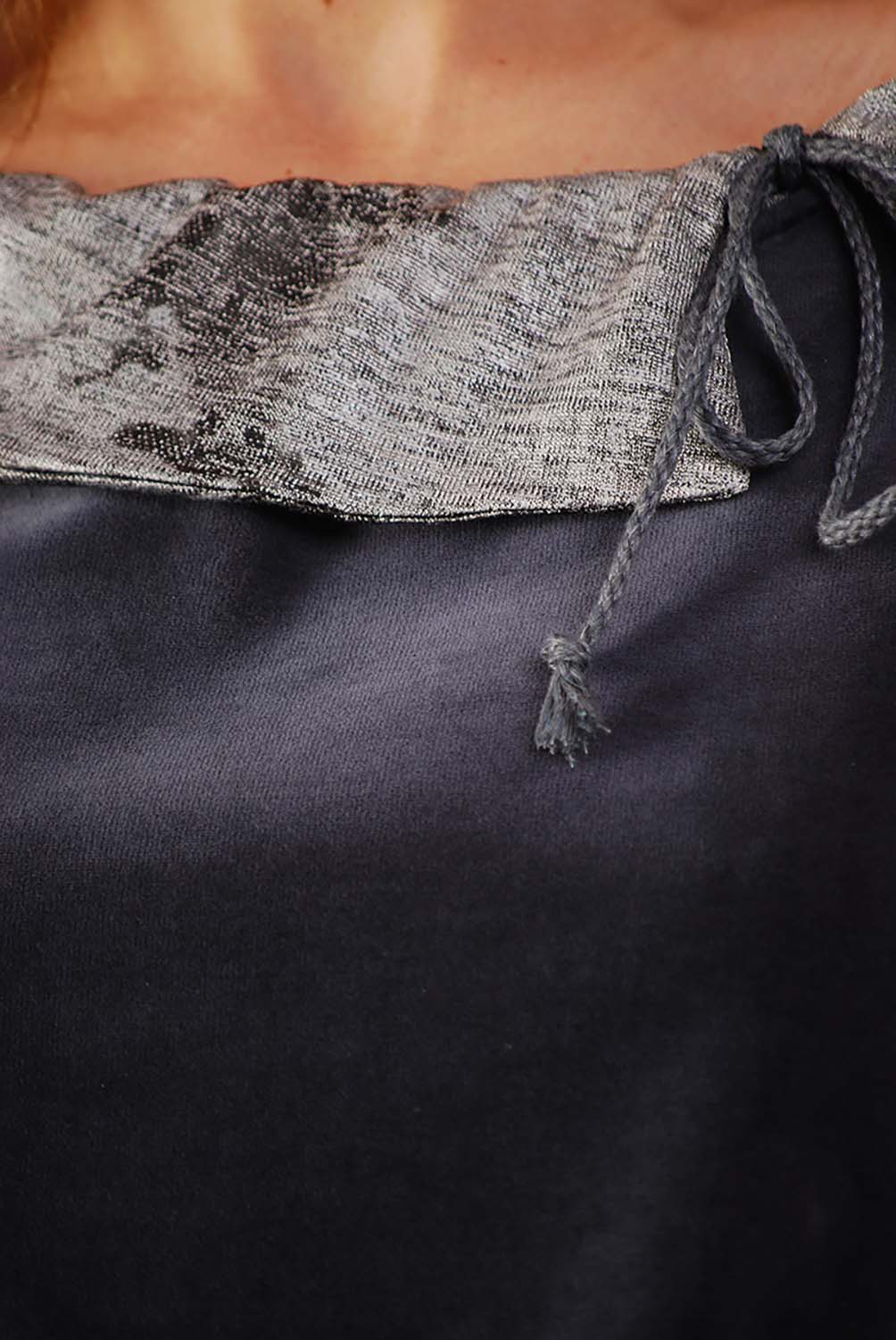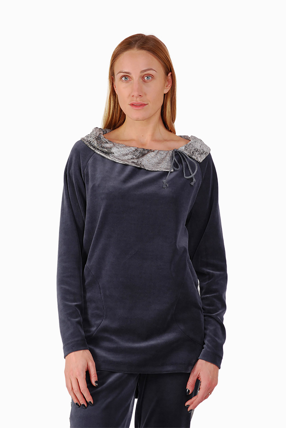 Stilingas bliuzonas laisvalaikiui pasiūtas iš malonaus dėvėti medvilninio audinio. Palaidinės konstrukcija puikiai prisitaiko prie įvairių figūros tipų. Kitos spalvos apykaklė, jos plotis reguliuojamas įvertų raištelių pagalba.