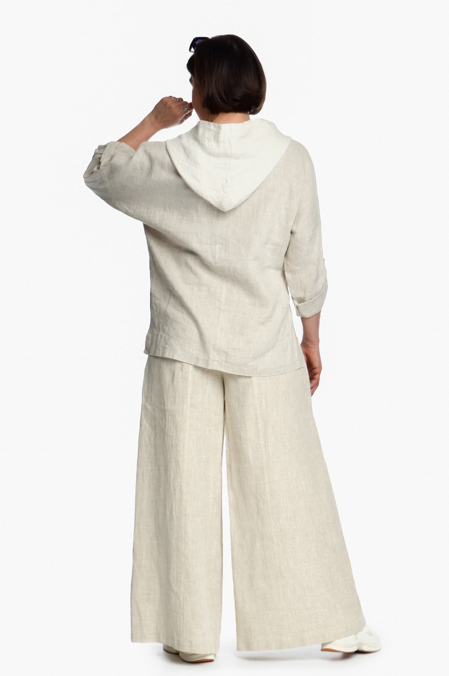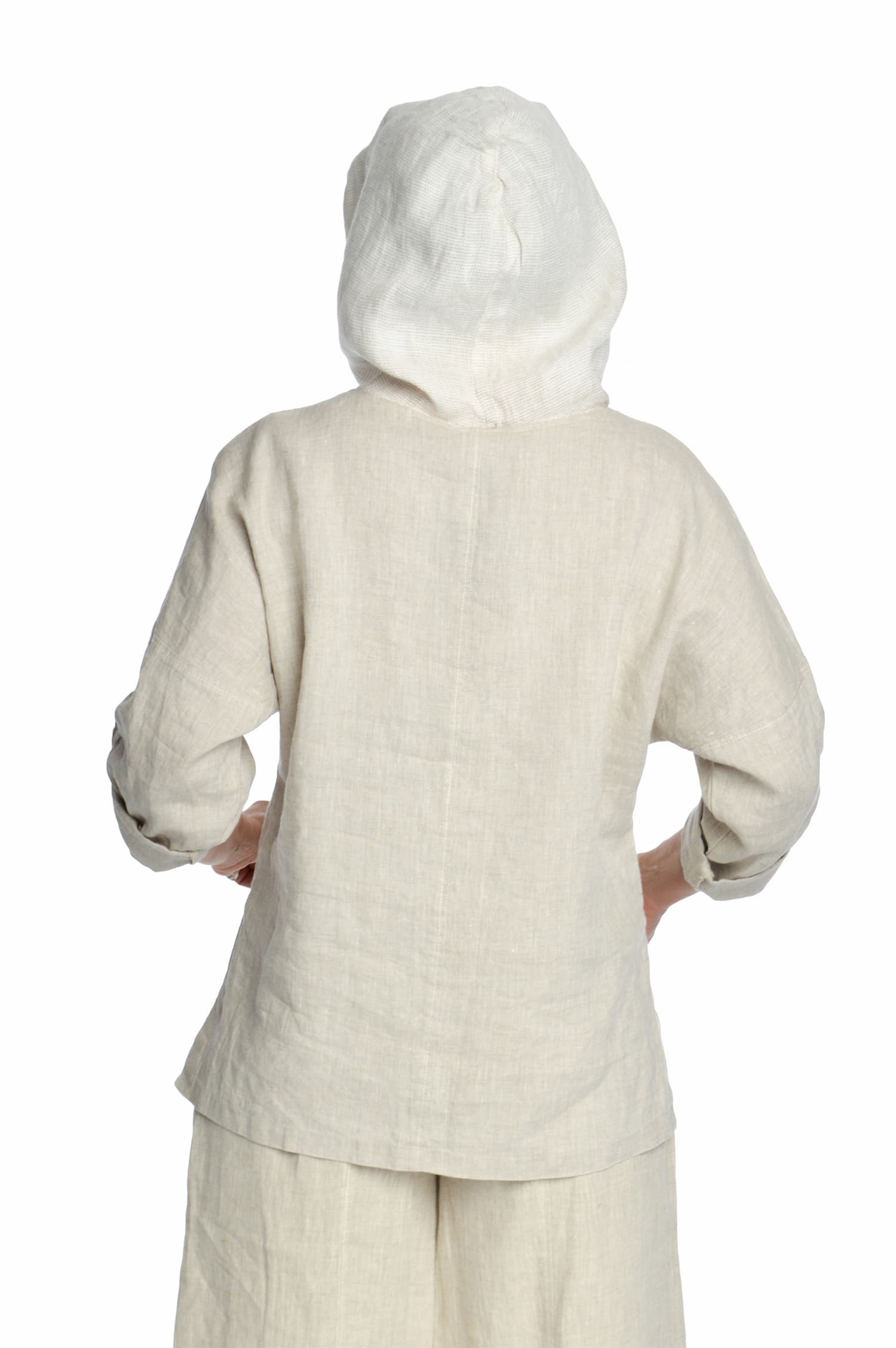 Laisvo stiliaus bliuzonas su gobtuvu. Bliuzono nugarinė dalis yra šiek tiek ilgesnė nei priekinė. Bliuzono apačia sutraukiama linine virvele su ribotuvais – reguliuojamas apačios plotis. Taip pat reguliuojamas rankovių ilgis. Bliuzonas puoštas storo peltakio siūlėmis.