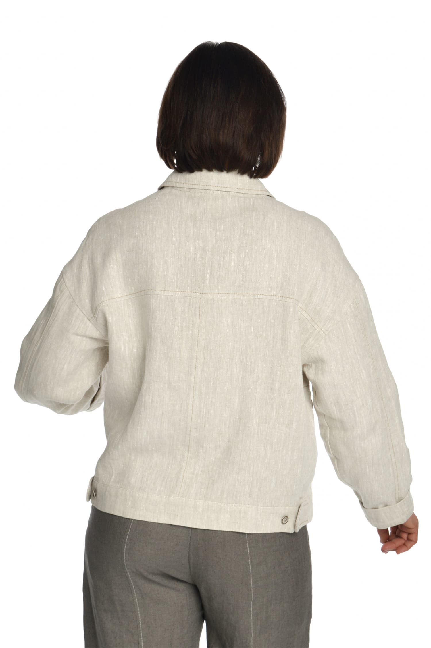 Užsagstomas, tiesaus silueto, lininis švarkelis su apykakle. Reguliuojamas rankovių ilgis atlanką užlenkiant į viršų. Sagomis reguliuojamas švarko apačios plotis. Šoninės kišenės dekoruotos antkišeniais.