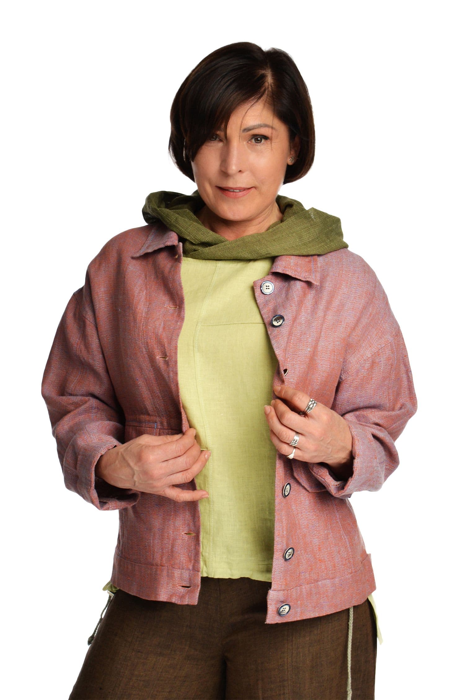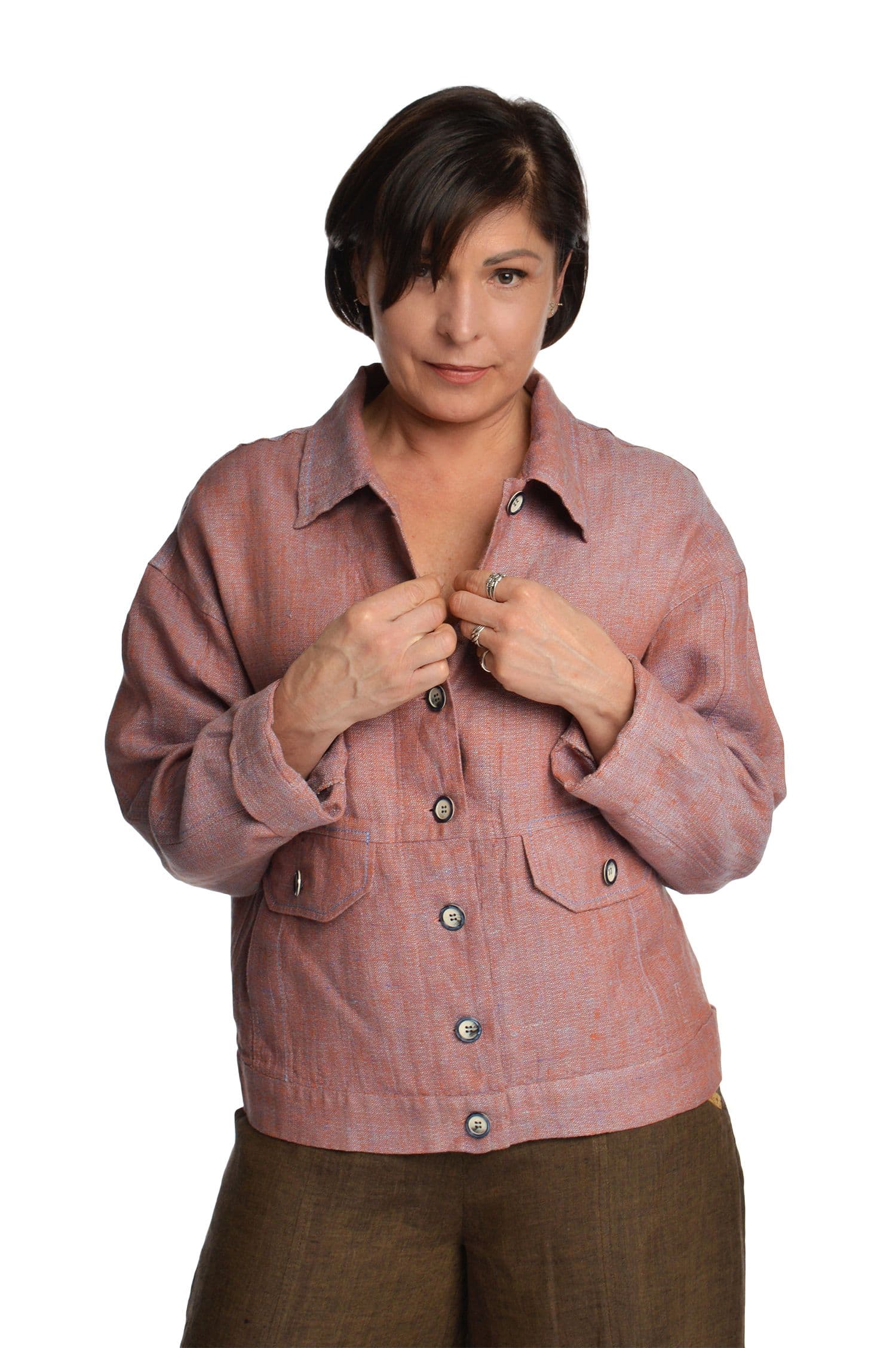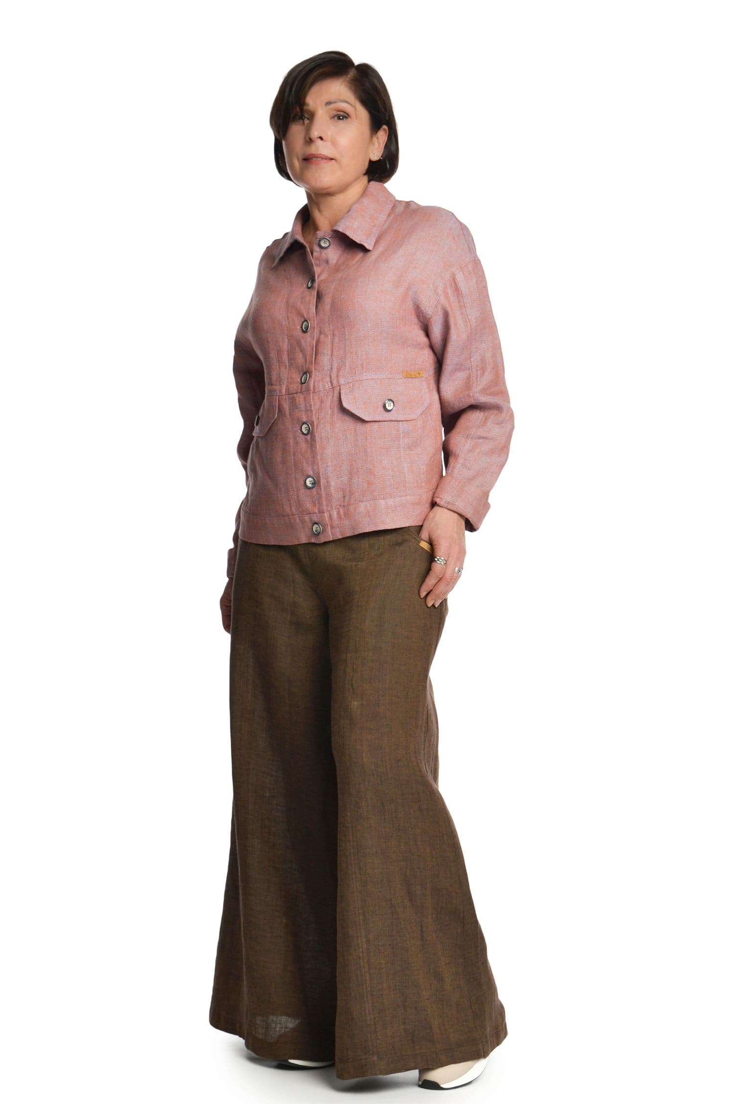 Užsagstomas, tiesaus silueto, lininis švarkelis su apykakle. Reguliuojamas rankovių ilgis atlanką užlenkiant į viršų. Sagomis reguliuojamas švarko apačios plotis. Šoninės kišenės dekoruotos antkišeniais.