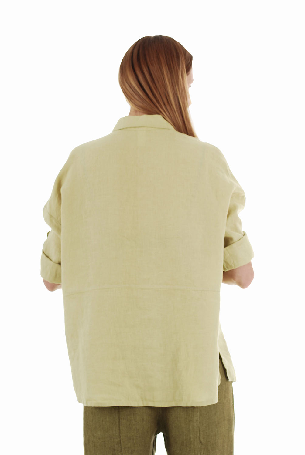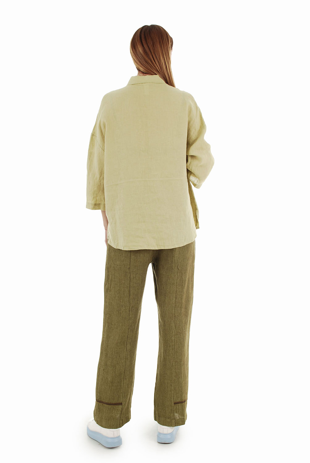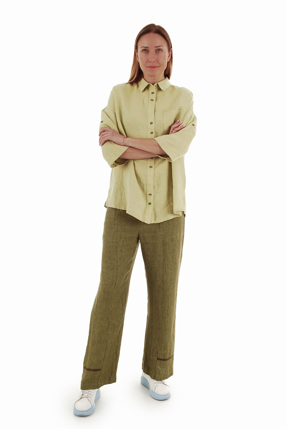 Laisvo stiliaus lininiai marškiniai – palaidinė. Pusilgės, reguliuojamo ilgio rankovės. Su kišenėle priekyje ir skeltukais šonuose. Modernūs, dekoruoti horizontaliomis siūlėmis.