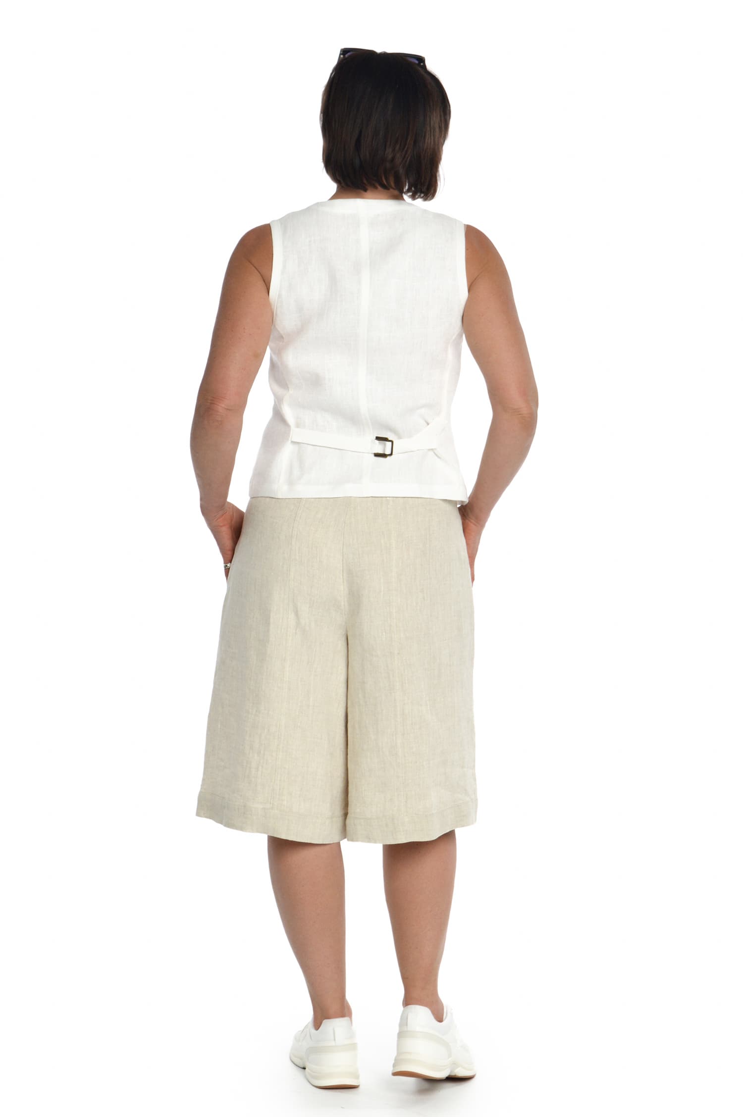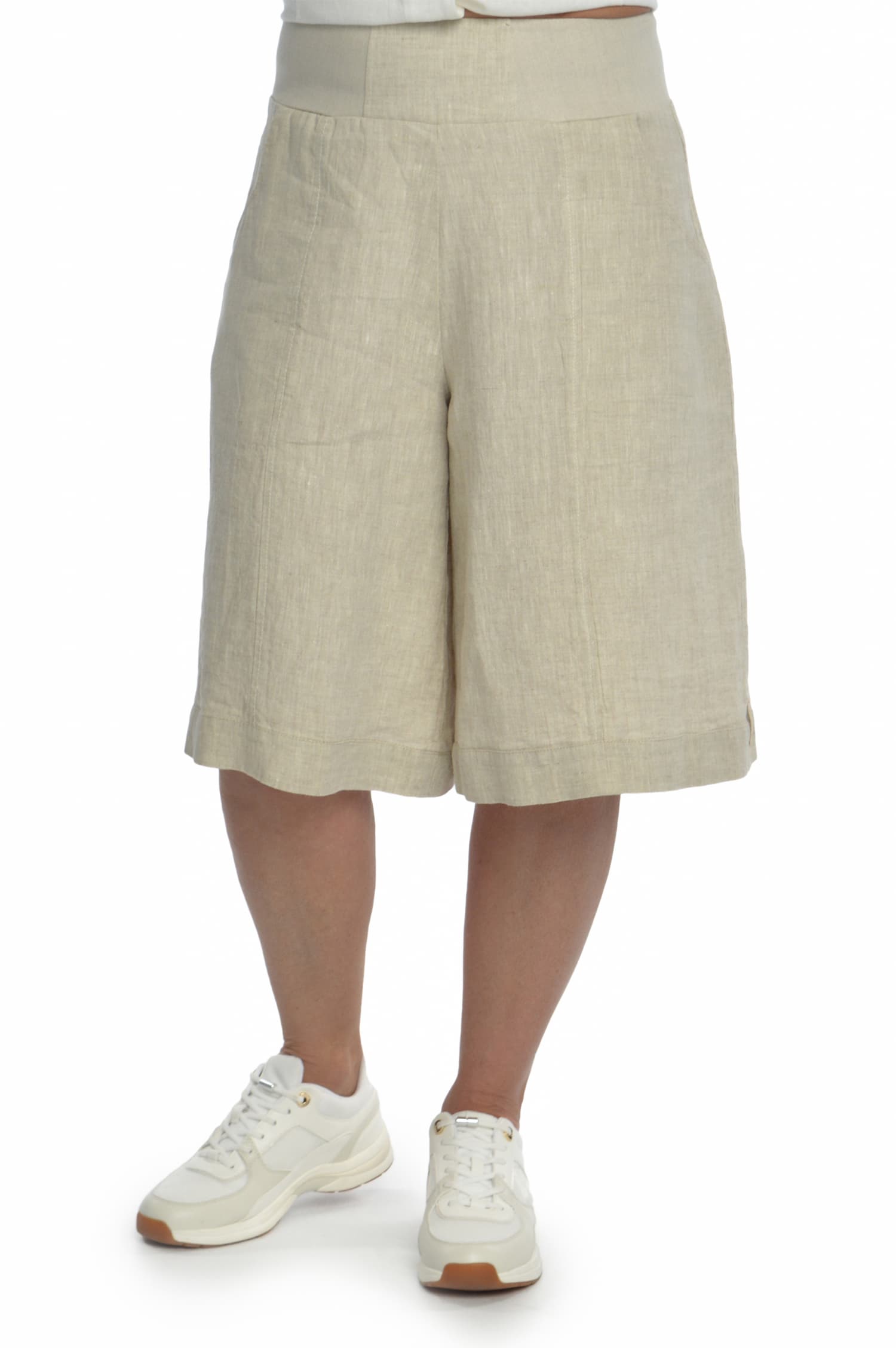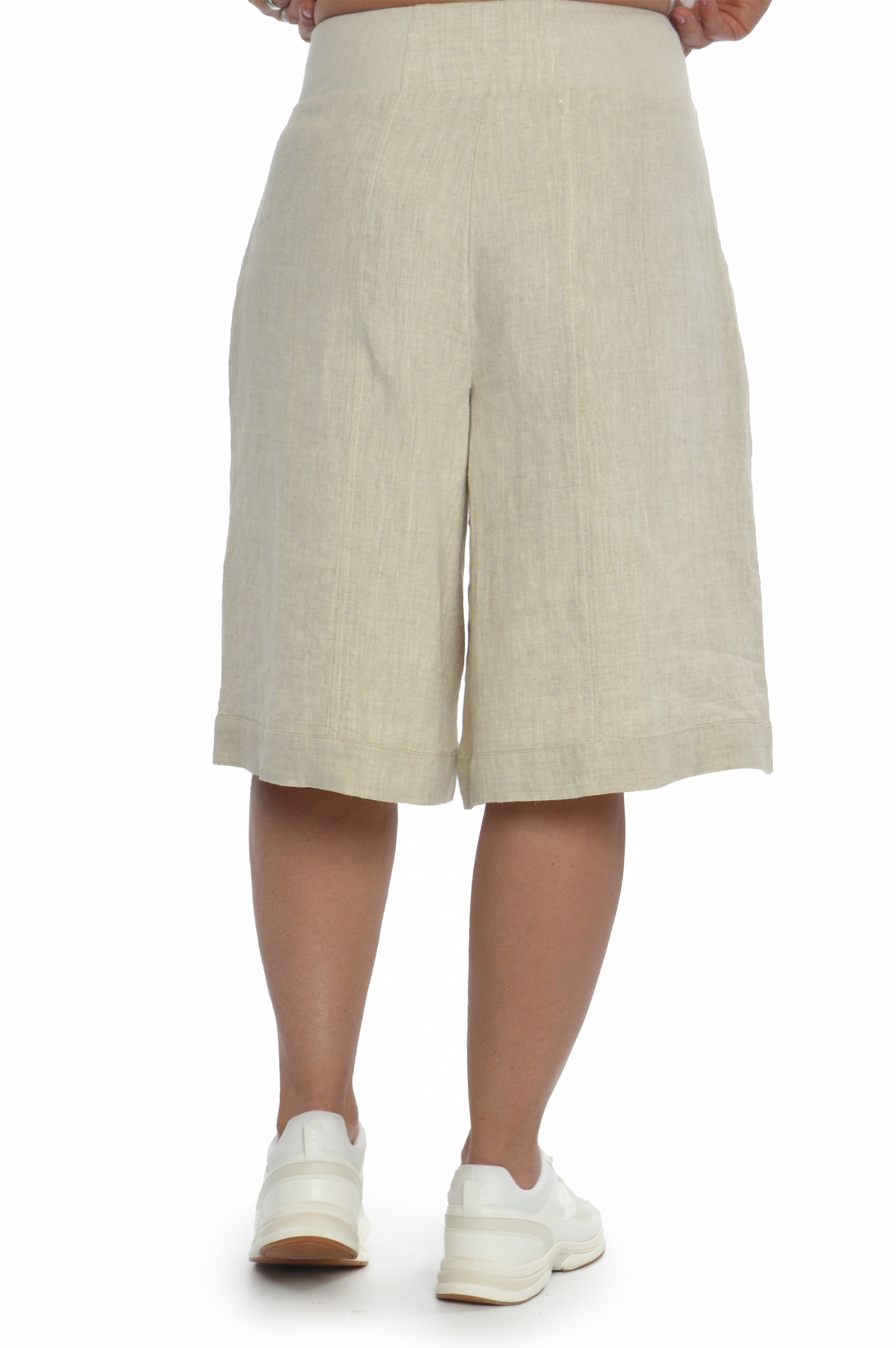 Lininiai šortai iki kelių. Siluetas: šortai prie klubų prigludę, o į apačią – platėjantys. Liemuo pasiūtas iš lino su elastanu, tad patogiai prisitaiko pagal liemens apimtį. 2 dekoratyvios kišenės priekyje.