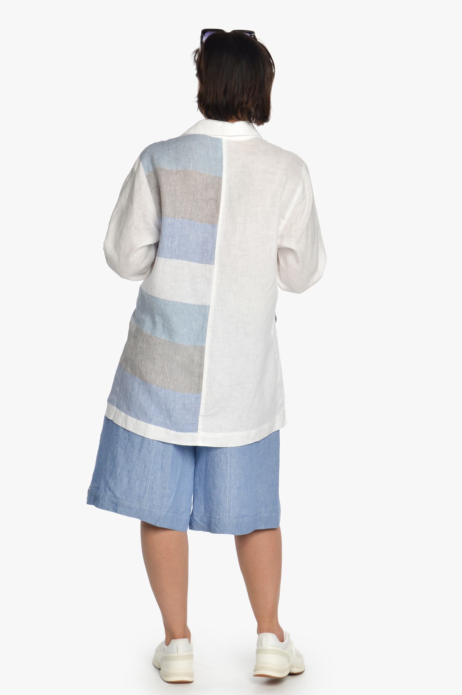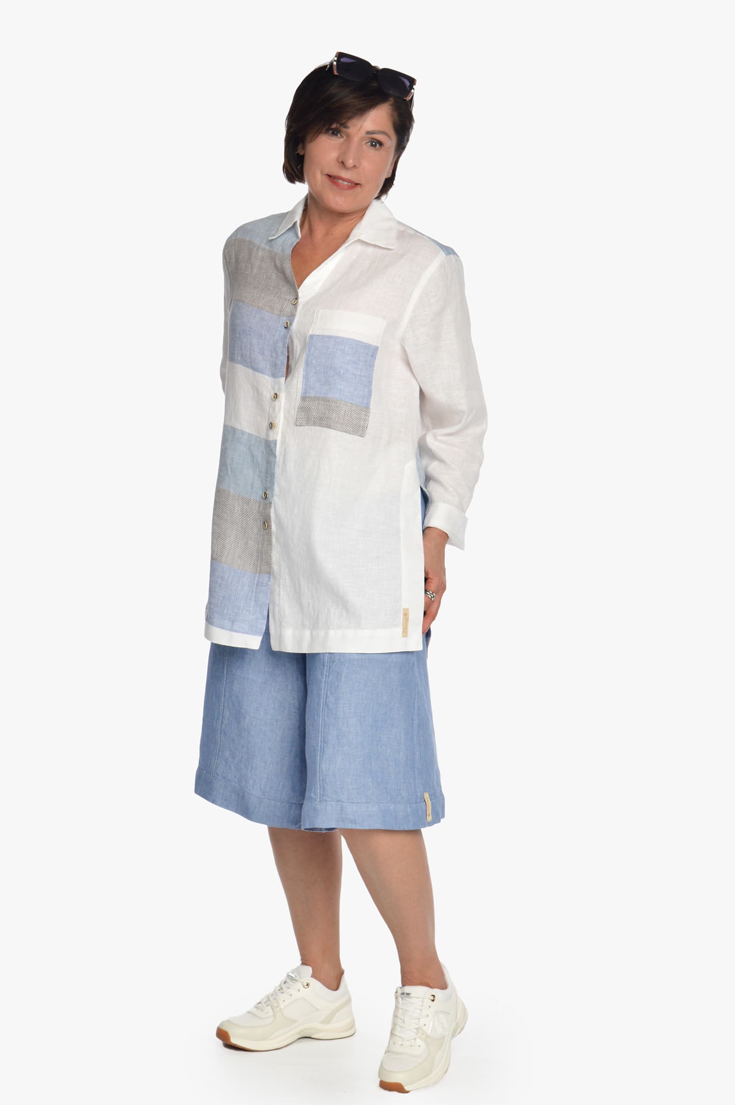 Lininiai šortai iki kelių. Siluetas: šortai prie klubų prigludę, o į apačią – platėjantys. Liemuo pasiūtas iš lino su elastanu, tad patogiai prisitaiko pagal liemens apimtį. 2 dekoratyvios kišenės priekyje.
