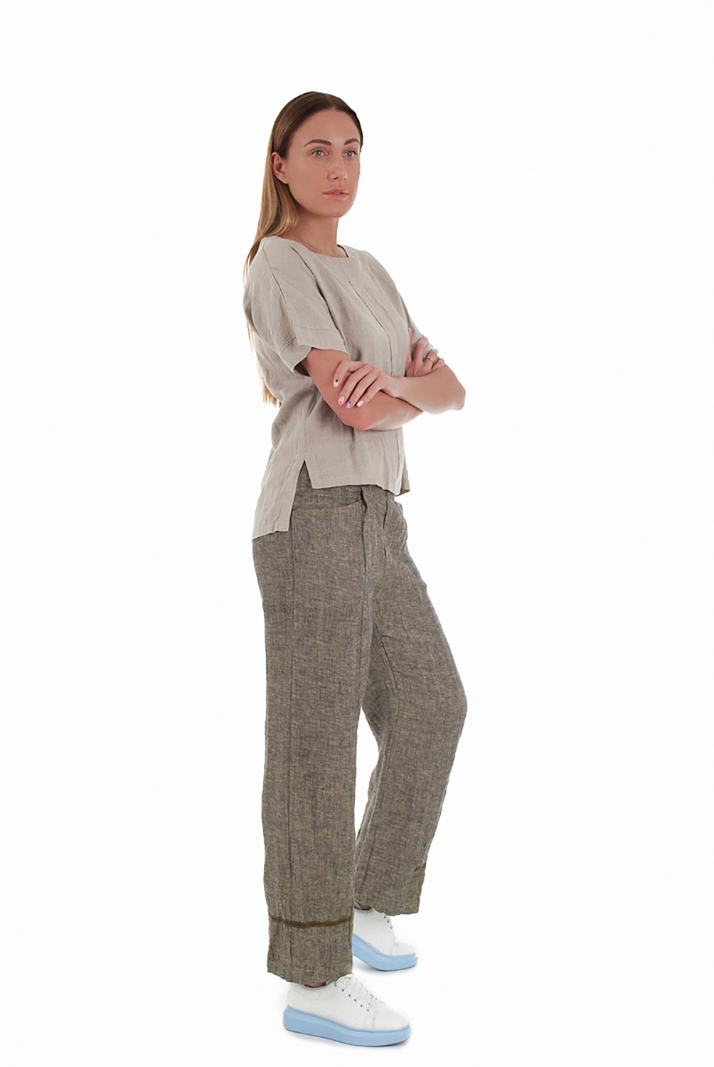 Moteriškos lininės kelnės, tiesaus silueto, rusvai žalios