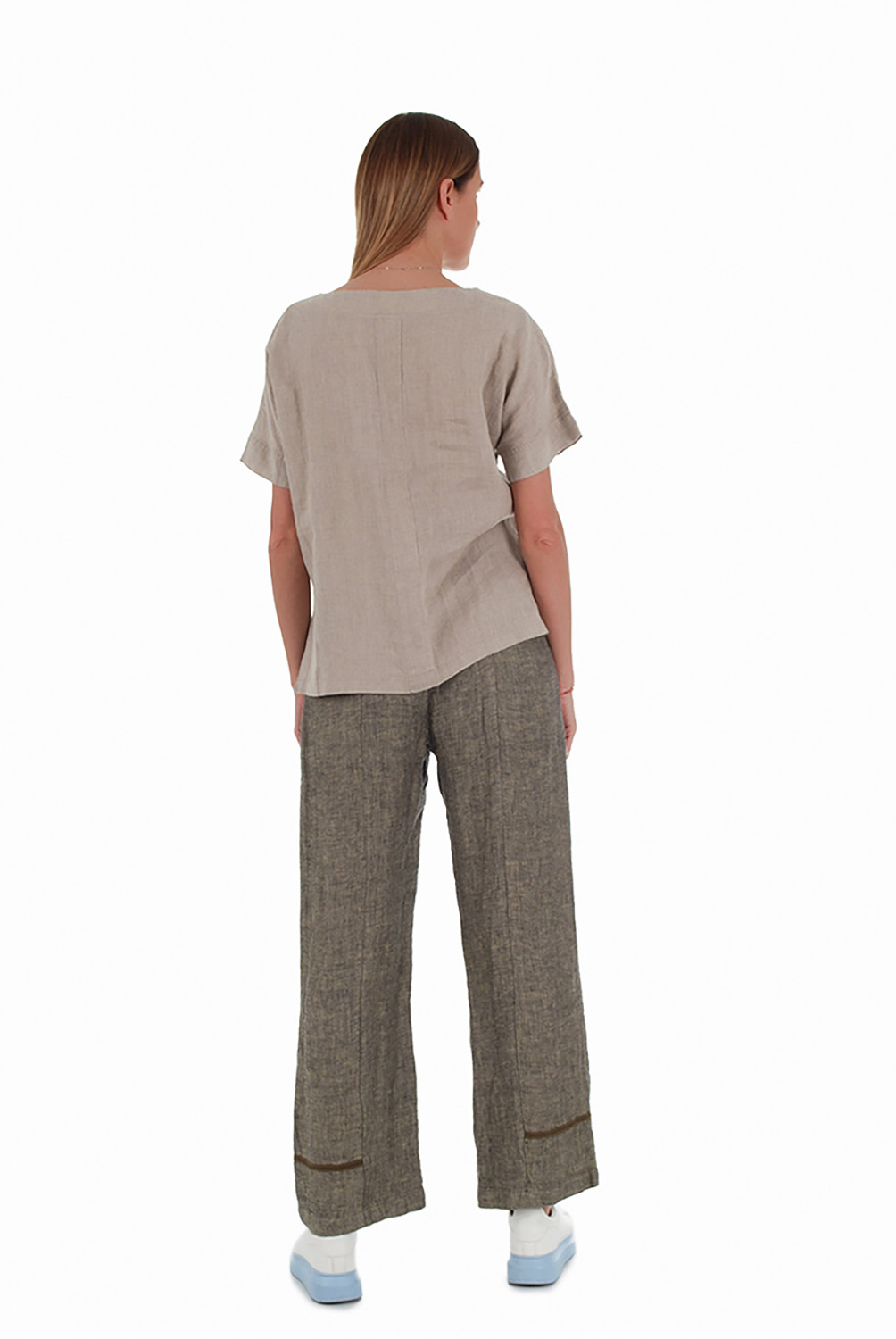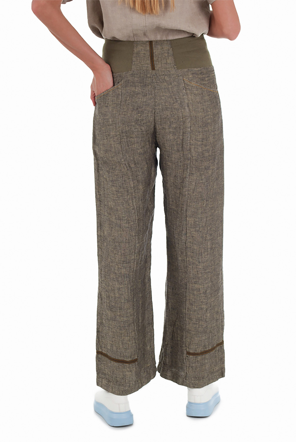 Lininių kelnių juosmuo iš lino su elastanu – patogi, dekoratyvi diržo imitacija. Juosmuo patogiai priglunda prie liemens. Kelnių apačia dekoruota kito audinio juostele.