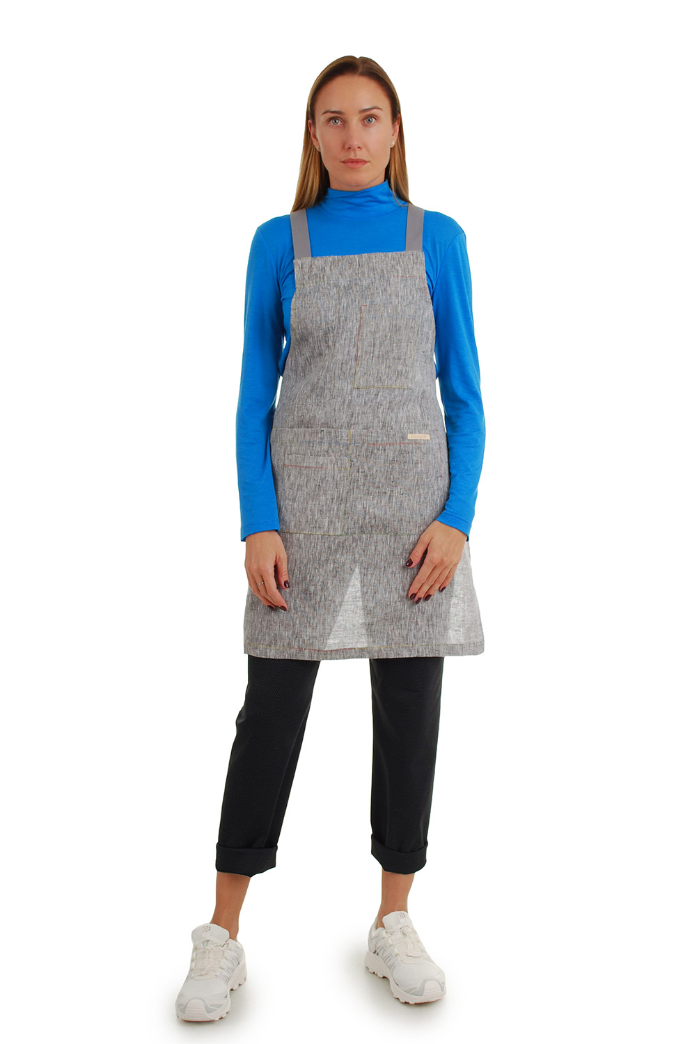 Susiūta pereinamų spalvų peltakio siūlu, kuris suteikia žaismingumo ir ryškumo. Dirželis, kurio ilgis yra 108 cm x 2, lengvai įveriamas į kilpas ir patogiai sukeičiamas bei užrišamas nugaroje. Prijuostės ilgis 85 cm. Gaminamas dydis universalus.