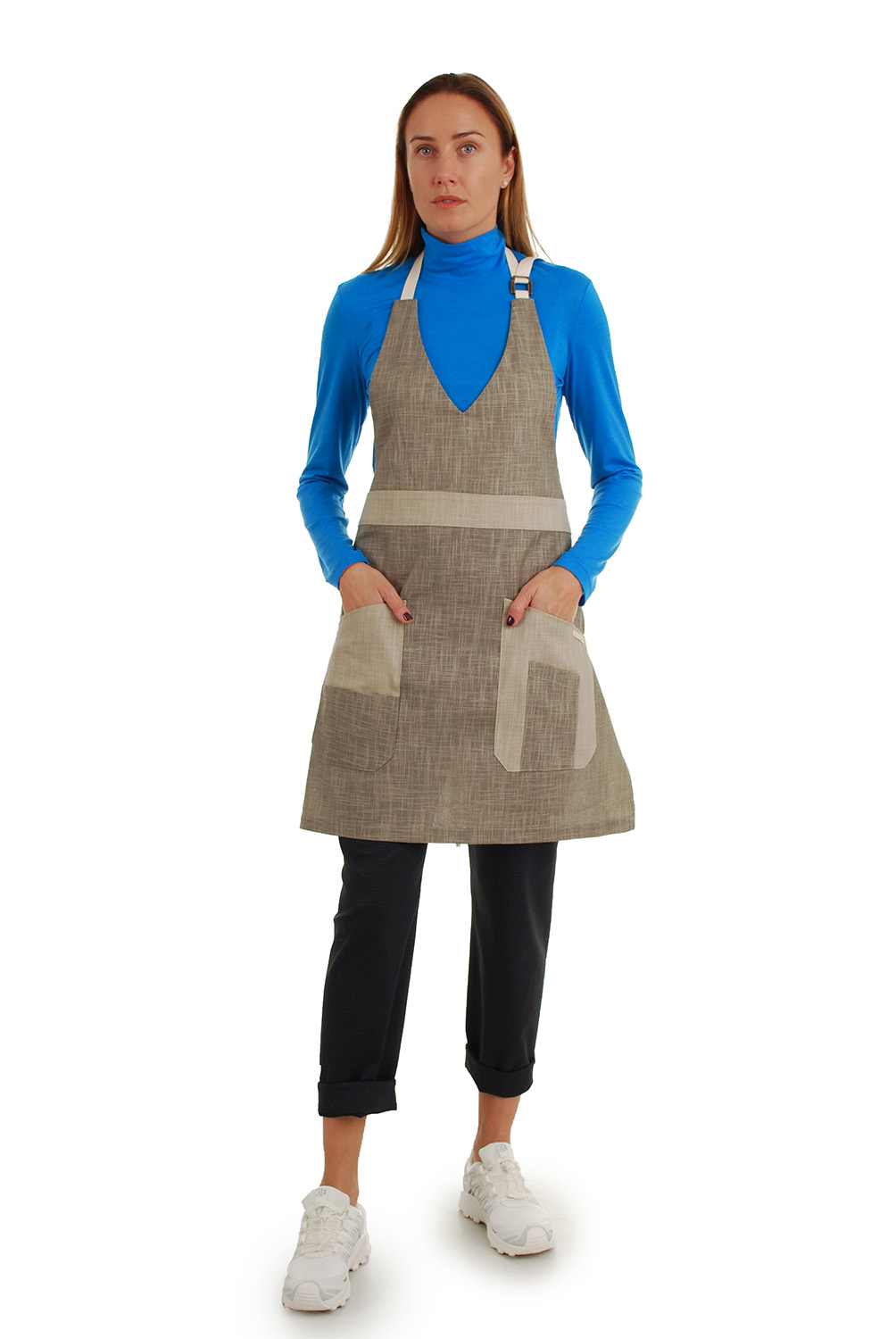 Stilinga prijuostė trikampiu kaklu, turinti 6 kišenes. Liemens dirželio ilgis 97 cm x 2 – galima apjuosti ir surišti priekyje. Kaklo dirželio ilgis reguliuojamas sagtele. Prijuostės ilgis 85 cm. Gaminamas dydis universalus.