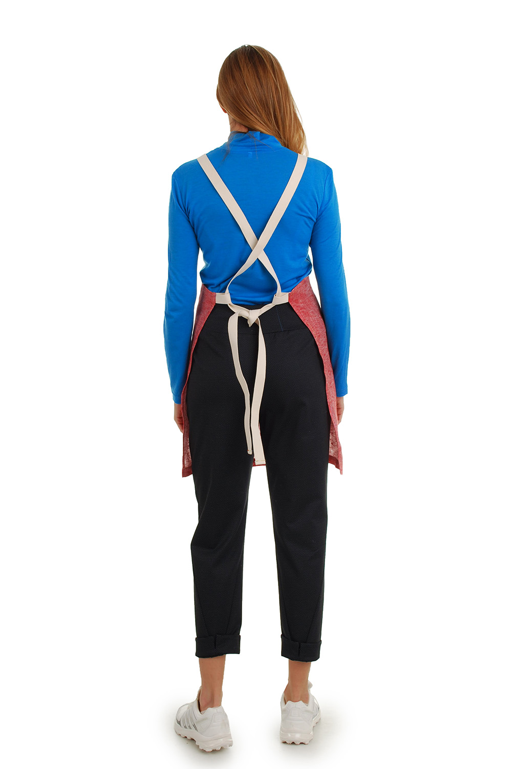 Susiūta pereinamų spalvų peltakio siūlu, kuris suteikia žaismingumo ir ryškumo. Dirželis, kurio ilgis yra 108 cm x 2, lengvai įveriamas į kilpas ir patogiai sukeičiamas bei užrišamas nugaroje. Prijuostės ilgis 85 cm. Gaminamas dydis universalus.