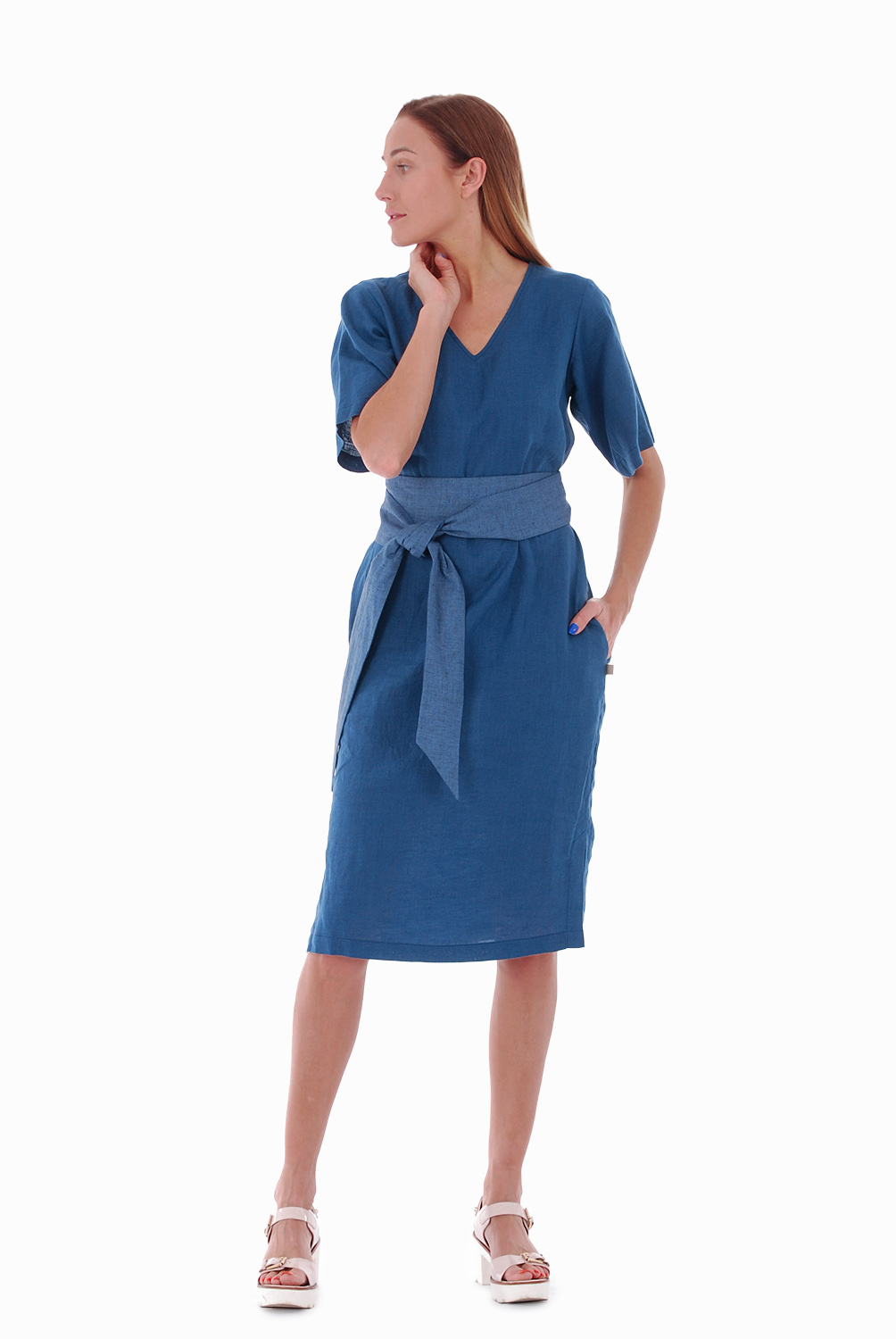 Siaura lininė suknelė trumpomis rankovėmis, mėlyna