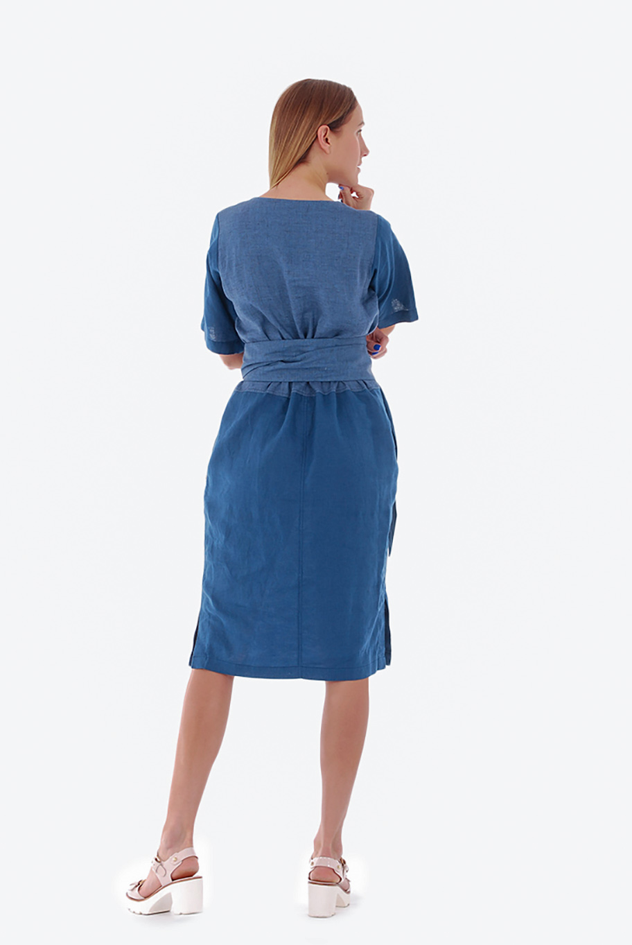 Siaura lininė suknelė trumpomis plačiomis rankovėmis – dviejų spalvų ir medžiagų derinys. Pridedamas ilgas lininis diržas.