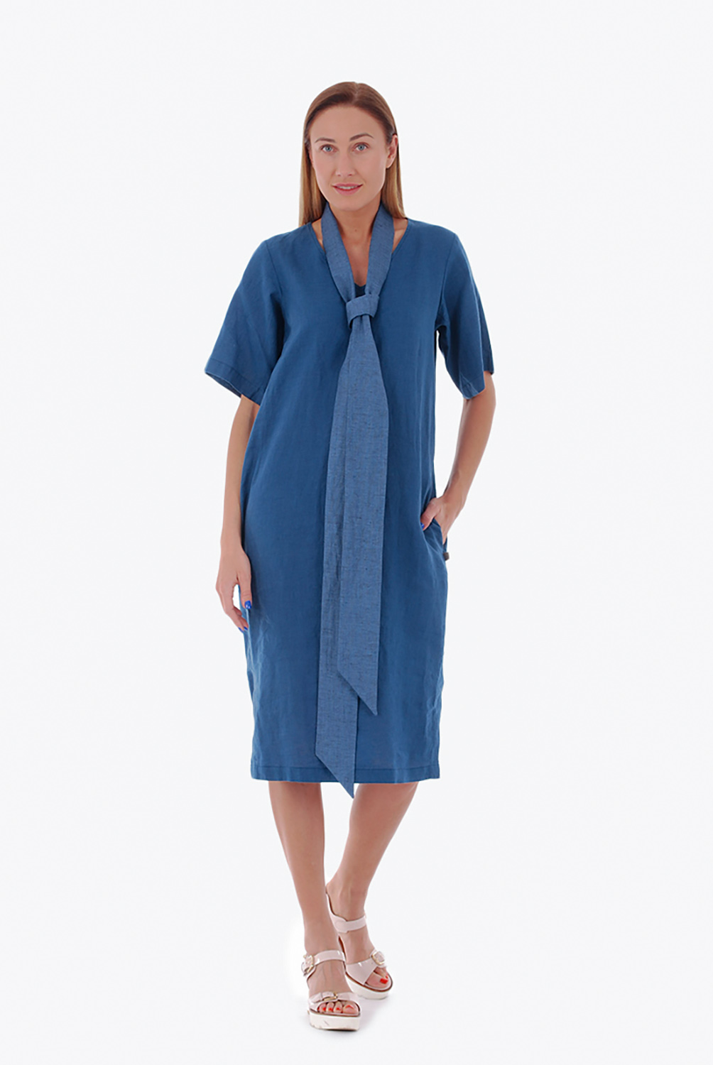 Vidutinio ilgio lininė suknelė su petnešėlėmis, žydra