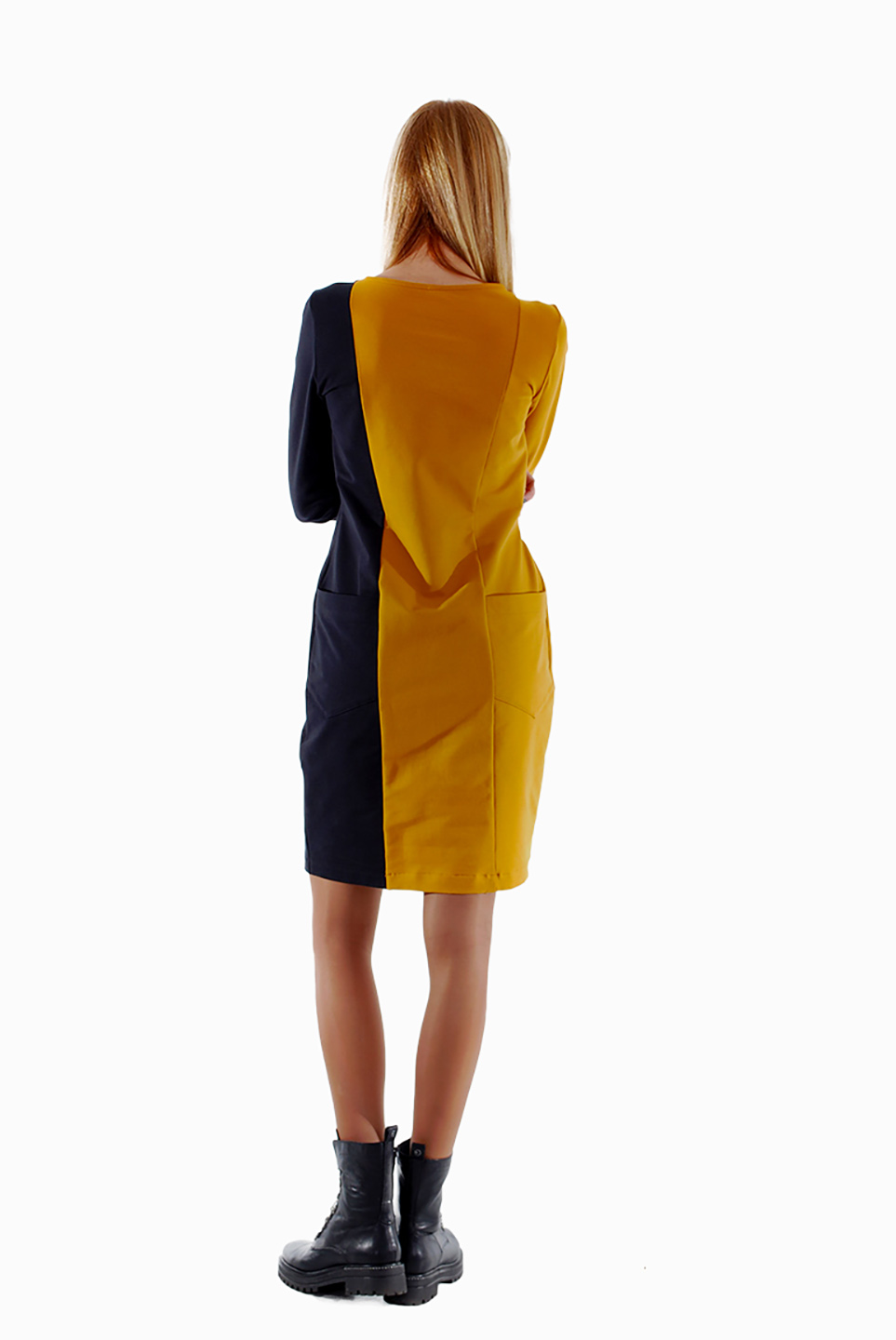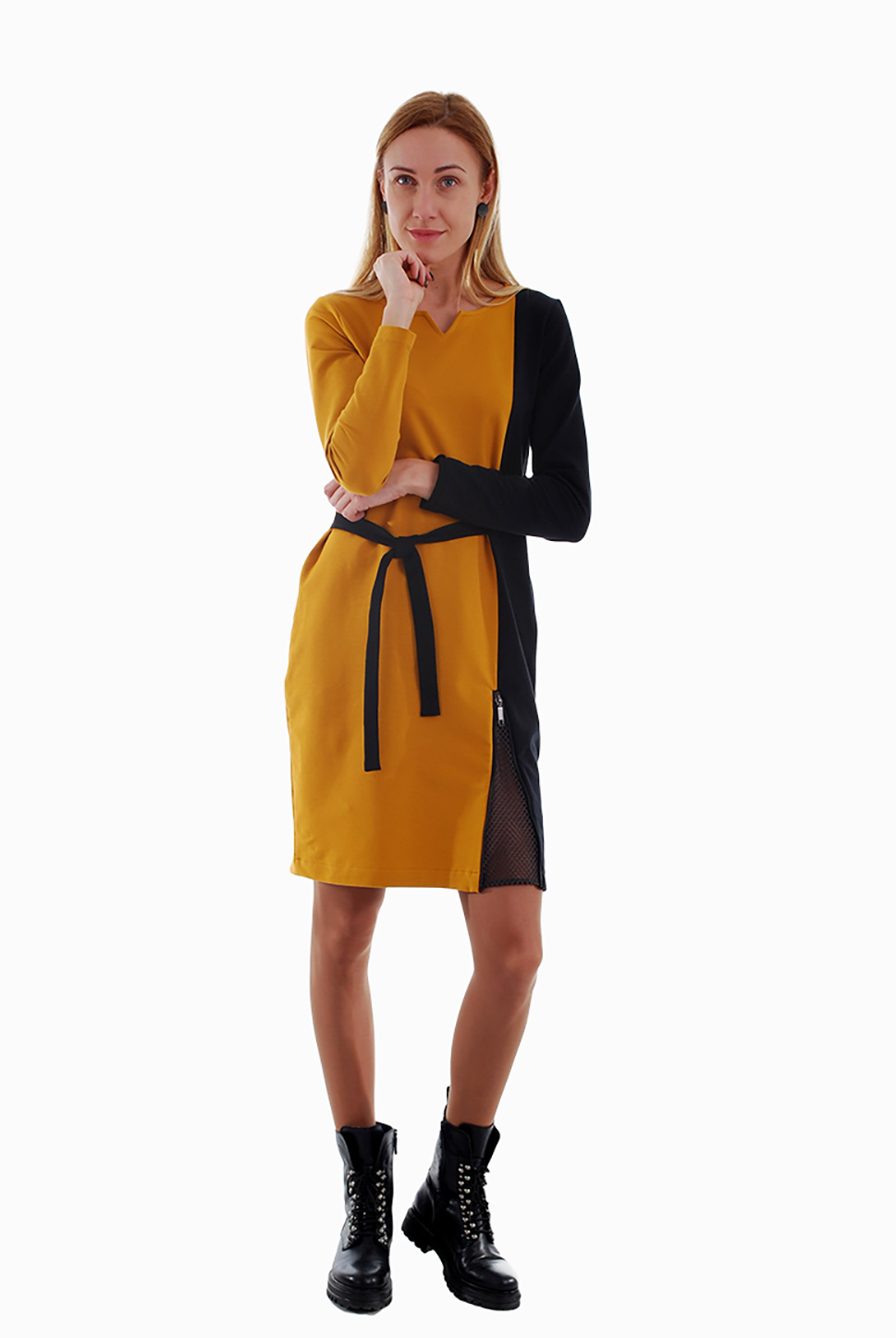Stilinga dviejų spalvų trikotažinė suknelė. Priekyje easntis užtrauktukas reguliuoja suknelės apačią.
