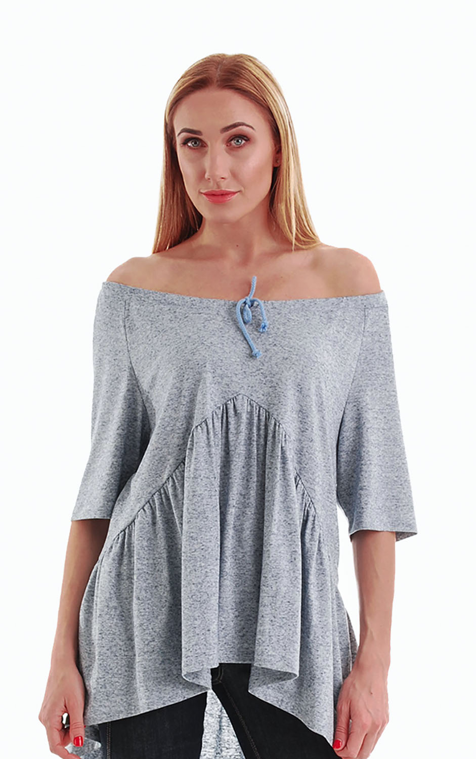 Trikotažinė palaidinė pasiūta iš tampraus bei malonaus dėvėti audinio. Palaidinės konstrukcija puikiai prisitaiko prie įvairių figūros tipų. Kaklo srityje įverta virvelė leis koreguoti pečių srities plotį ir palaidinę dėvėti atvirais pečiais.