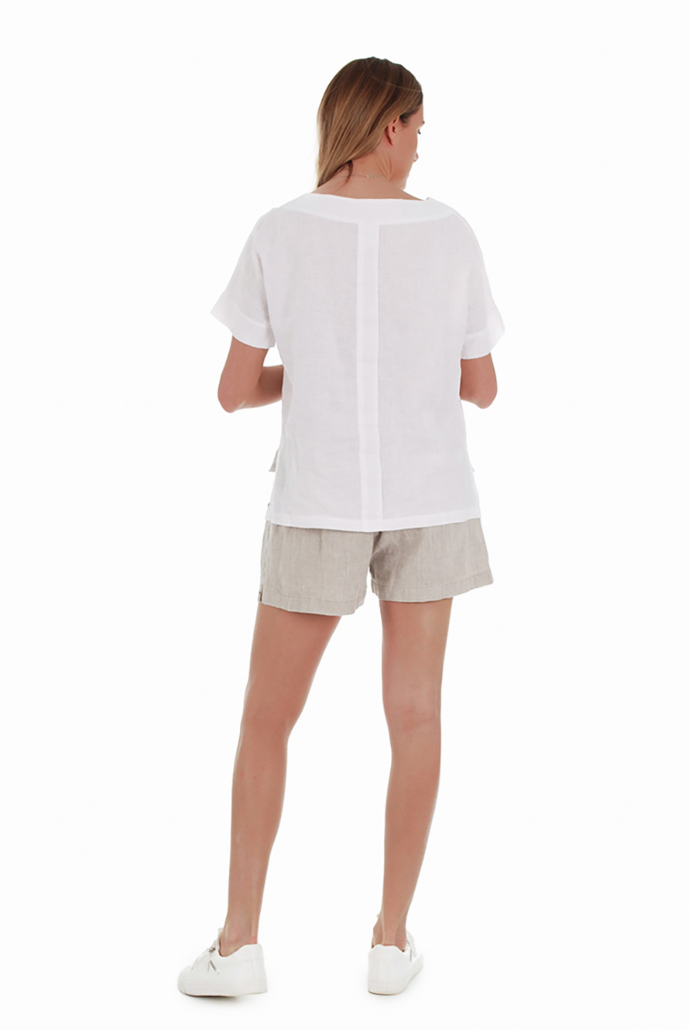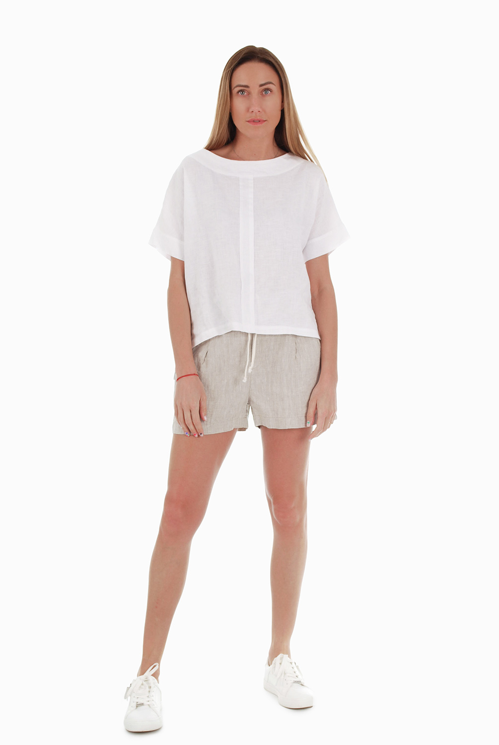 Trumpi platūs moteriški lininiai šortai. Lininių šortų priekyje esančios klostelės vizualiai lieknina klubus. Priekyje yra dvi kišenės ir užtrauktuko imitacija. Juosmuo siūtas iš lininio audinio su elastanu. Išskalbus nereikia lyginti.