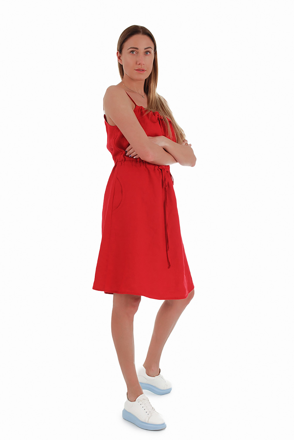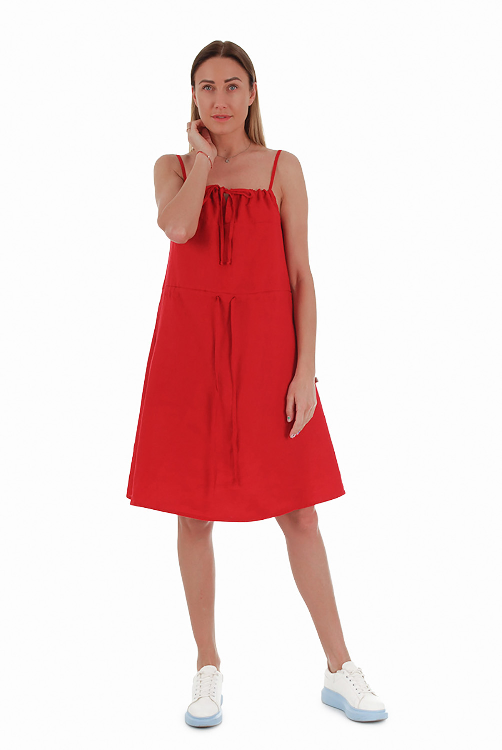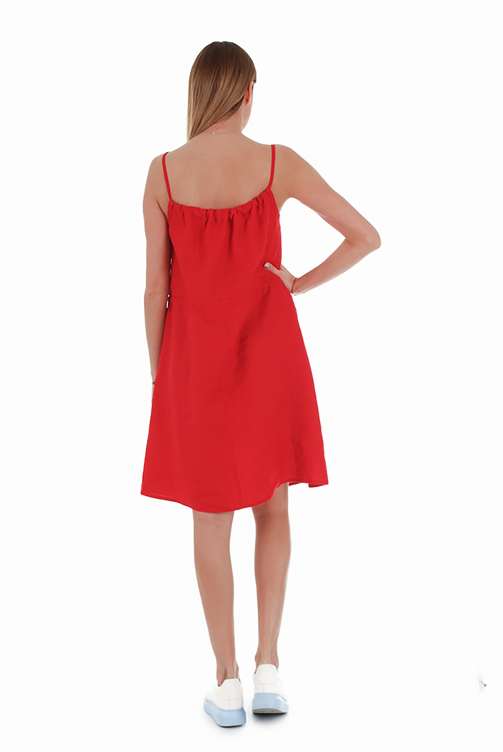 Vidutinio ilgio lininė suknelė su petnešėlėmis, raudona