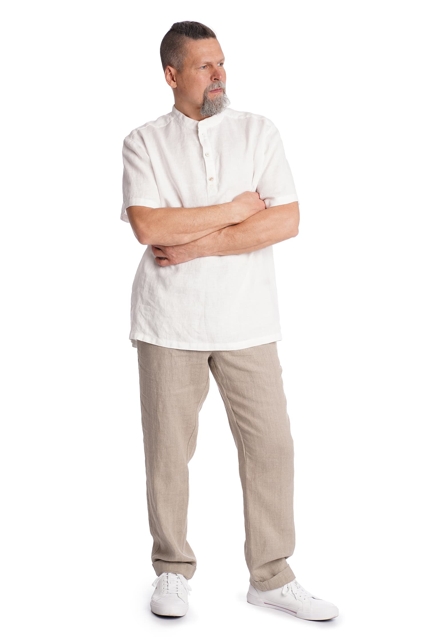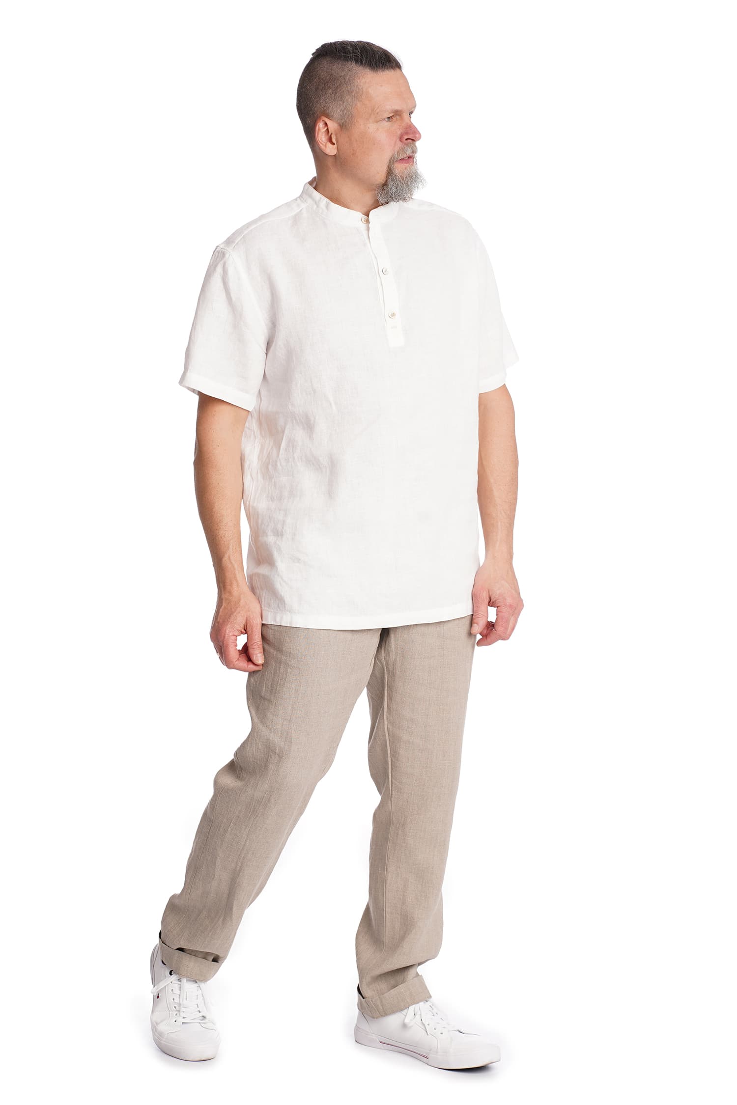 Plono lino marškiniai trumpomis rankovėmis. Stačia apykaklė, dekoruota įsiūtu kanteliu. Susagstomi ties kaklu, apačia tiesi. Plonas linas ypatingai tinka karštam vasaros orui.